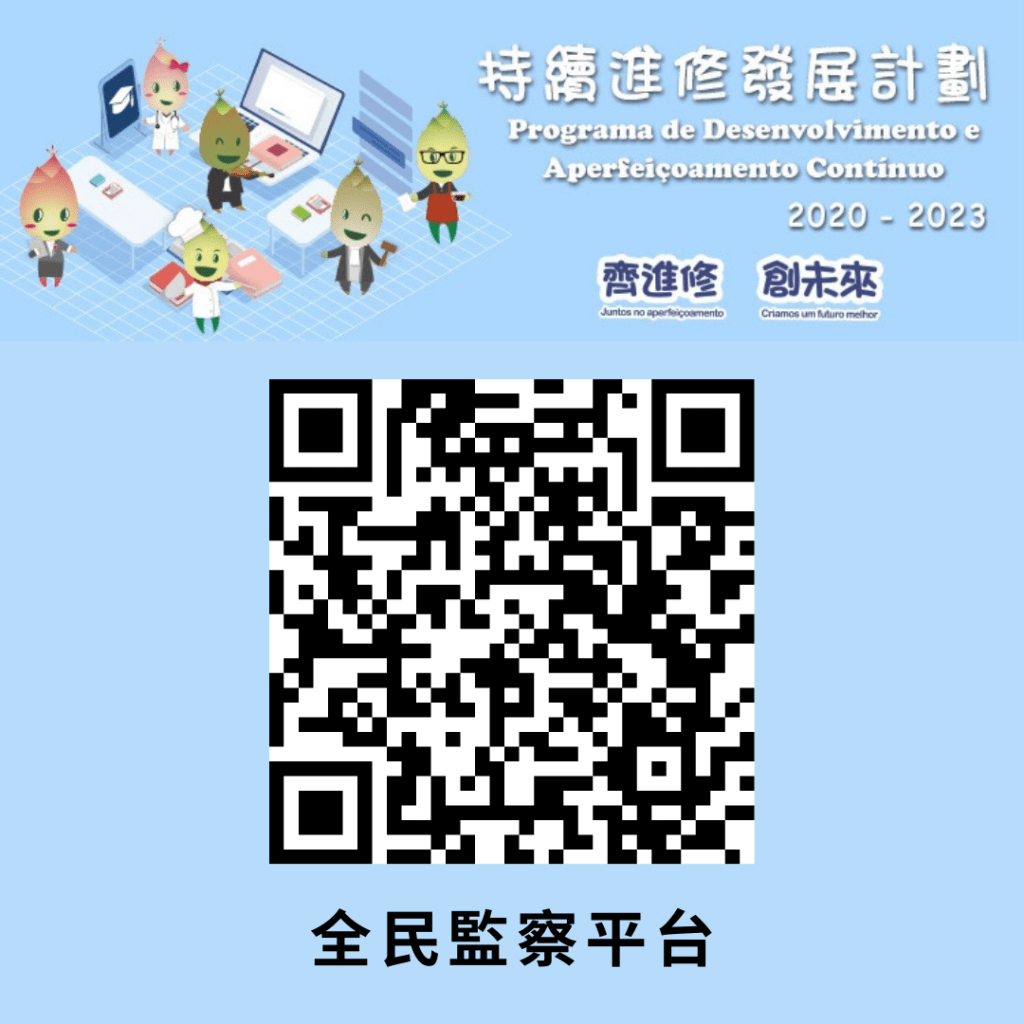 教青局強調絕不姑息任何違法違規行為,並會持續嚴謹執行監察工作。同時再次呼籲參與「持續進修發展計劃」的機構及居民須遵守法紀,切勿以身試法。倘居民發現參與「計劃」的機構或居民有違反規定的情況,可通過電話:2842 5199、電郵(pdac@dsedj.gov.mo)、親臨舉報或掃描以下全民監察平台反映,教青局會即時嚴正跟進。倘發現刑事違反情節,定必移送檢察機關處理。