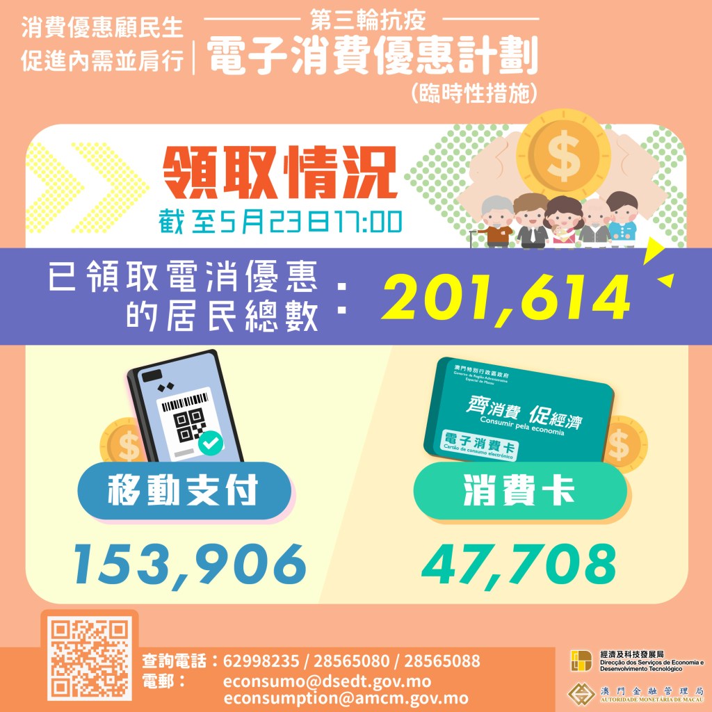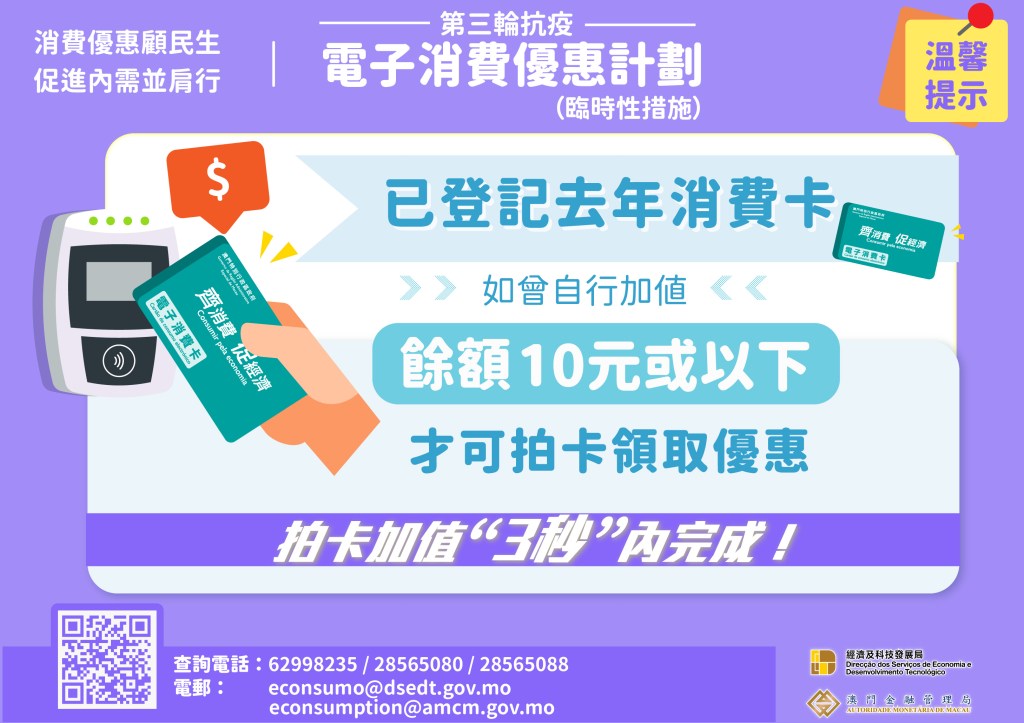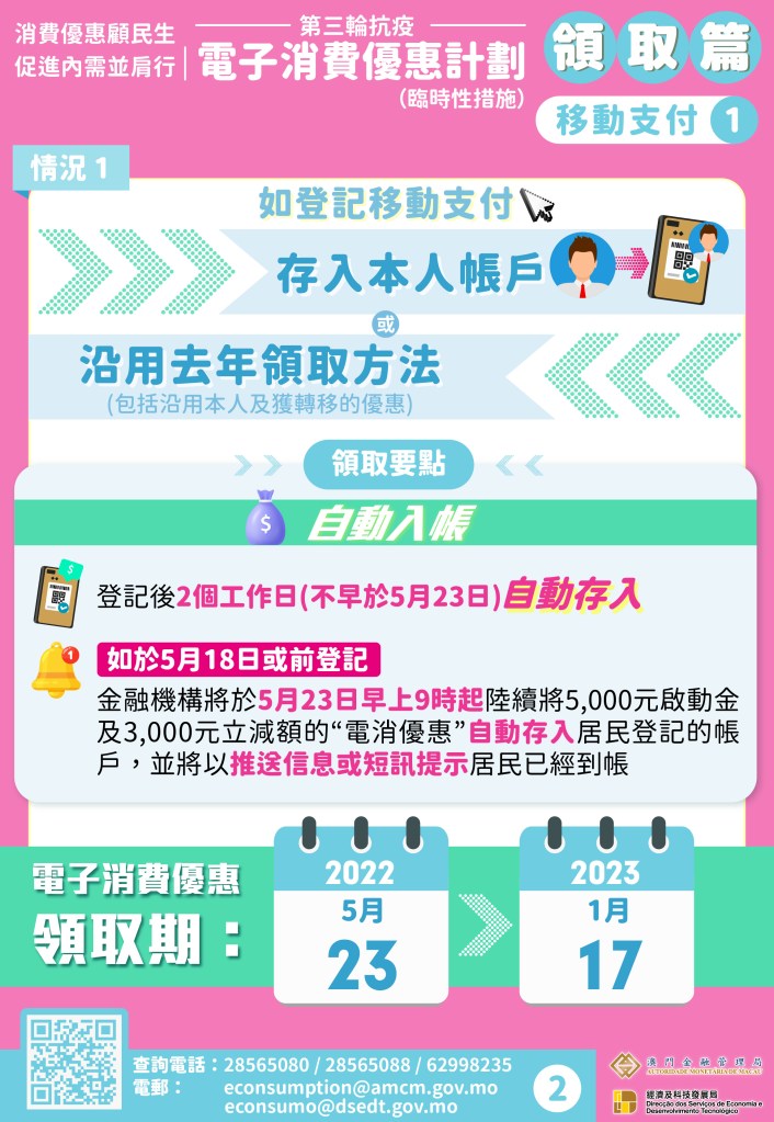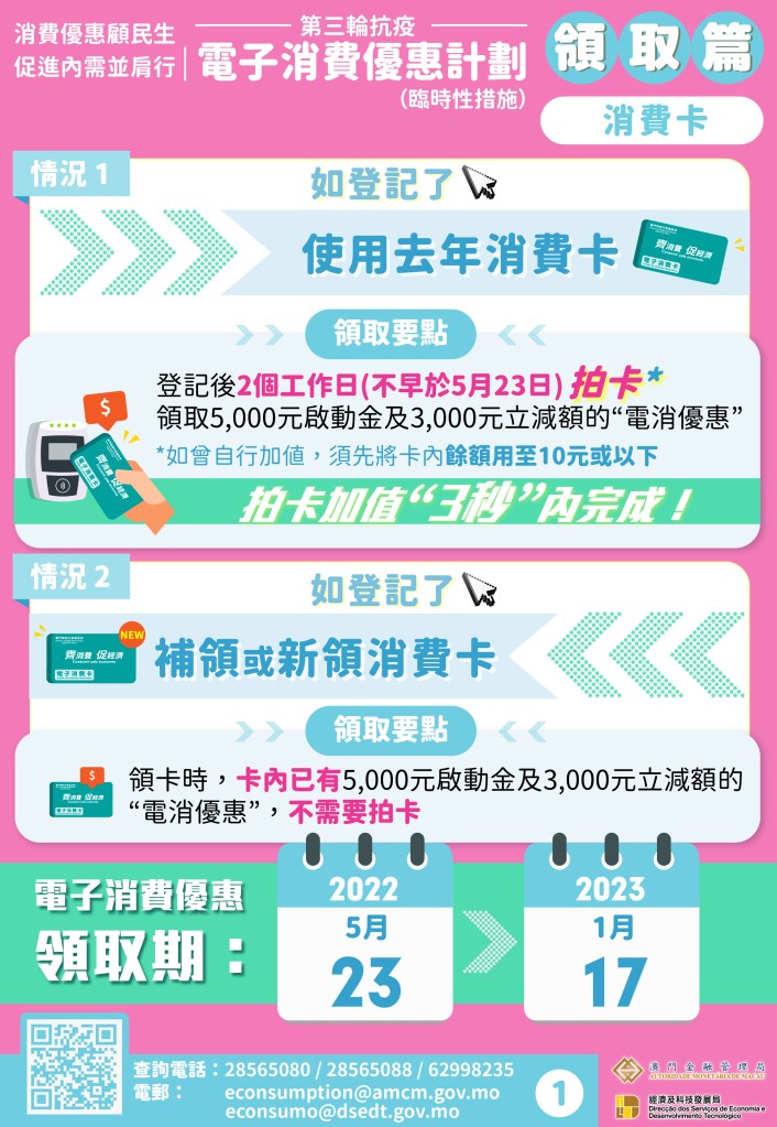 「電消優惠」領取期至2023年1月17日,使用期由2022年6月1日至2023年2月28日。而登記期由2022年5月10日開始,截至今日下午5時,已有449,752名居民完成登記,當中208,059登記移動支付,241,693登記消費卡。居民如於5月18日後登記以仍有效的消費卡享用優惠,於登記後2個工作日可到全澳174個拍卡加值點拍卡領取優惠(拍卡服務點:https://www.dsedt.gov.mo/econsumo/zh-hant/topup_loc.jsp ),必須注意於拍卡前,可到澳門通指定商戶將卡內餘額用至10澳門元或以下,或到澳門通辦理退回餘額手續,方能成功拍卡。如補領或新領消費卡,卡內已有優惠,無需再進行拍卡。領卡時需帶備身份證正本,如委託他人代領,則需提交聲明書或授權書(領卡服務點:https://www.dsedt.gov.mo/econsumo/zh-hant/pickup_card_loc.jsp )。