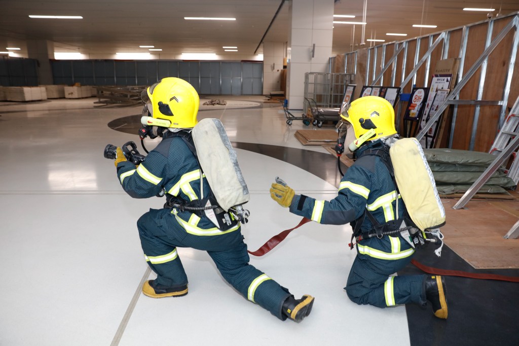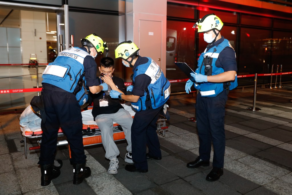 演習模擬在邊檢大樓一樓澳珠離境大堂免稅店倉庫發生火警,一名員工發現起火後即時通知主管人員,並嘗試使用滅火筒撲救,但因火勢猛烈未能成功撲滅,導致該名員工左手及面部二級燒傷且吸入濃煙,及後退出至安全位置等待救援。另一方面,主管人員立即致電港珠澳大橋邊檢大樓值日房,當值警官隨即致電999行動通訊中心,同時按照既定的通報機制通報大樓內辦公之其他部門之負責人,並迅速執行緊急疏散計劃,撤離人員及疏散旅客到集合點。