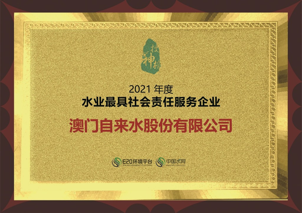 澳門自來水在一個由國內環保行業智庫E20環境平台聯合中國水網舉辦的2021年度(第十九屆)水業企業評選活動中,再次榮獲「最具社會責任服務企業」獎。自2012年第一屆評選以來,澳門自來水已連續10年獲得該獎項。
