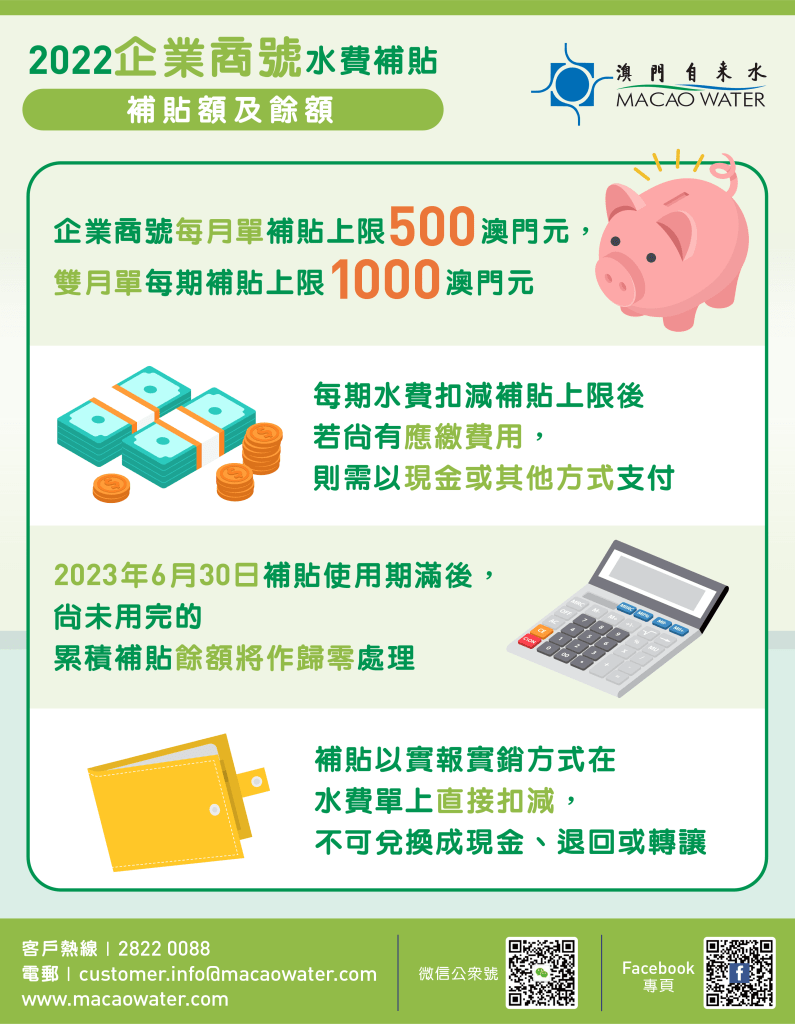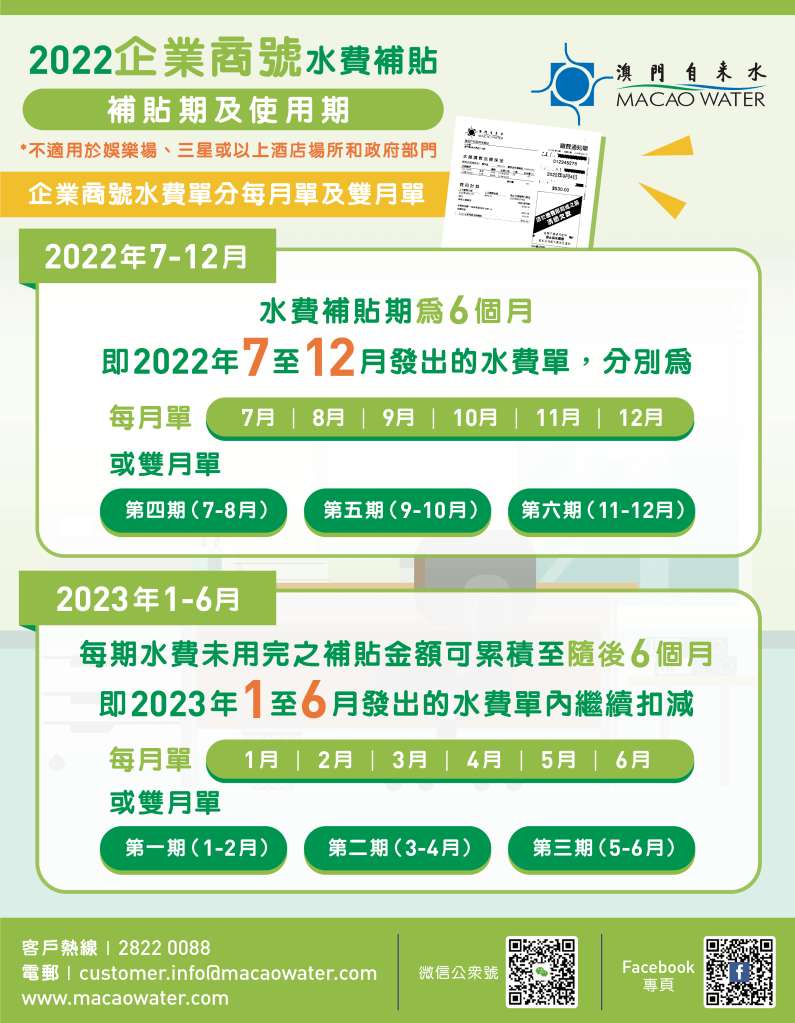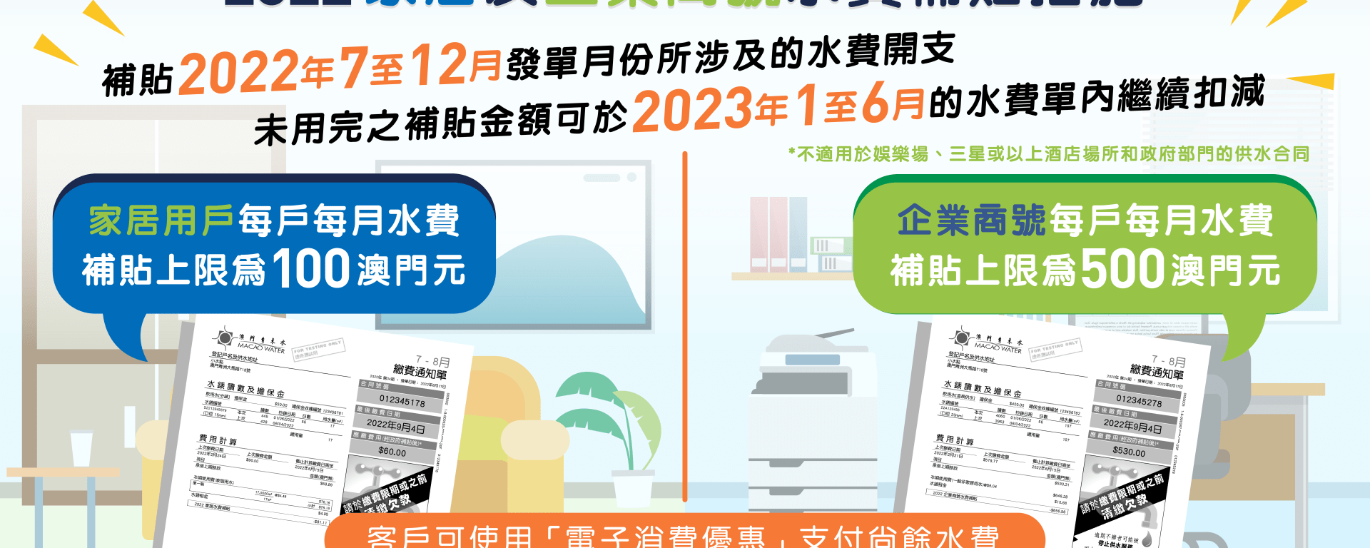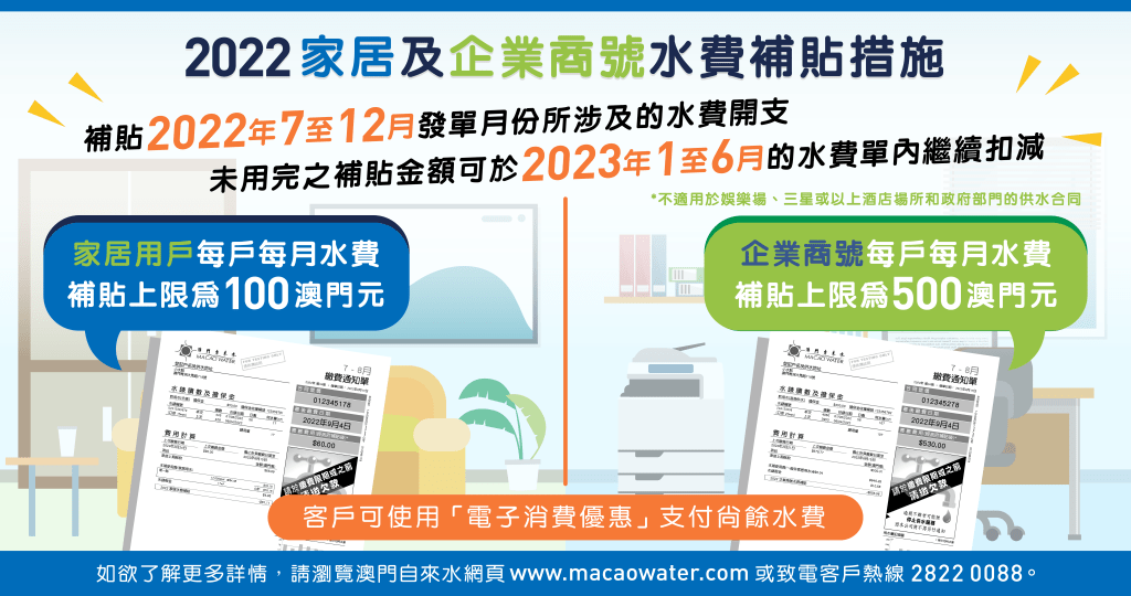 為配合澳門特區政府推出「2022 家居及企業商號水費補貼」措施,澳門自來水將對7月起至12月發出的水費單進行為期6個月的水費補貼,補貼使用期則合共為12個月,期滿後累積補貼餘額將作歸零處理。整項補貼措施估計約26萬戶合資格的家居及企業商號受惠。