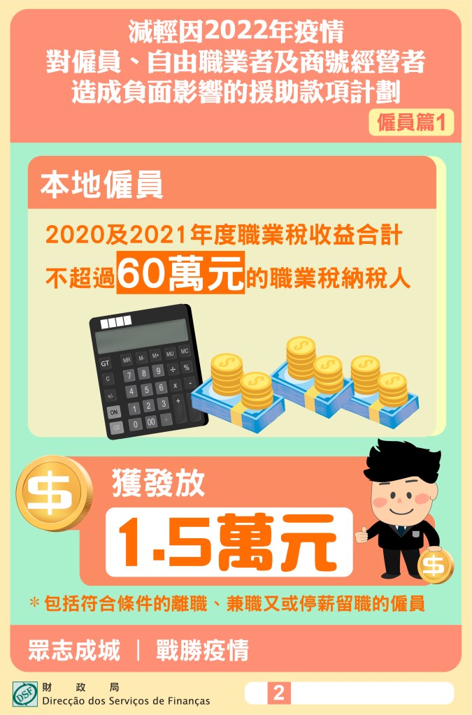 僱員援助方面,2020年及2021年兩年度內有工作收入但合計金額不超過600,000元(澳門元,下同)的本地僱員,包括符合工作收入條件但在疫情期間開工不足、停薪留職、兼職,以及離職的僱員,每人獲發放15,000元的援助款項。
