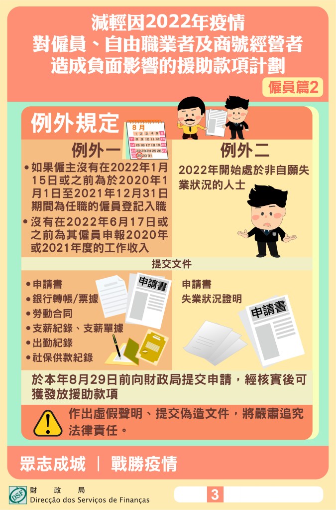 此外,於2022年1月1日至7月30日期間開始處於非自願失業狀況的本澳居民,透過申請及提交有關失業狀況的證明,經財政局核實其資料及資格後,亦可獲發放僱員援助款項。上述申請最遲須於2022年8月29日向財政局提交。