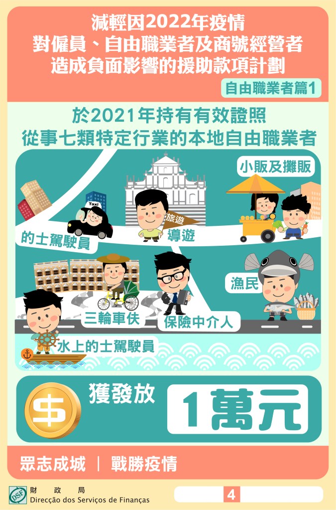 為減輕新冠疫情對民生和經濟的衝擊,特區政府於6月中旬公佈推出九項經濟援助及稅費減免措施,當中的《減輕因2022年疫情對僱員、自由職業者及商號經營者造成負面影響的援助款項計劃》行政法規於日前公佈,有關援助款項將於8月17日 (星期三) 起分批發放。