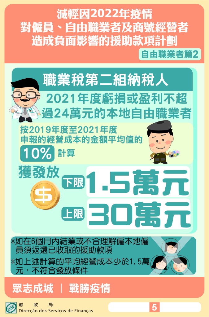 第二類為在財政局登記為職業稅第二組納稅人的本地自由職業者,如其於2021年度職業稅申報營業結果非為盈利或為盈利但金額不超過240,000元,將按其2019至2021年度申報的職業稅負擔金額平均值的百分之十計算,發放每人最少15,000元、最多300,000元的援助款項。