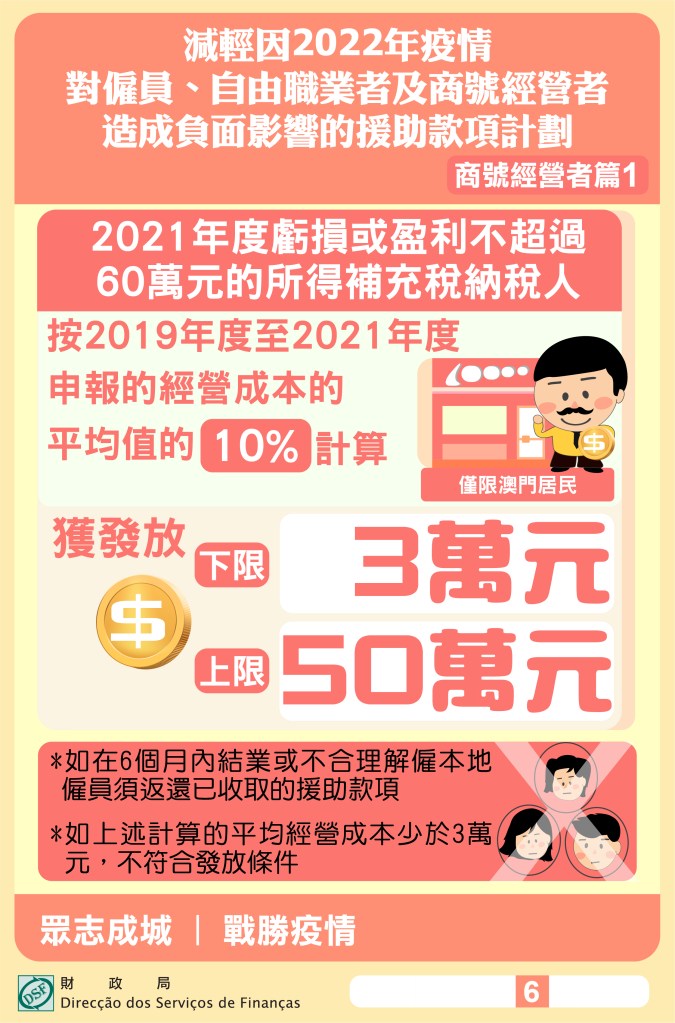 商號經營者援助方面,在財政局登記的所得補充稅納稅人(如屬自然人受益人,不包括非澳門居民),如其經營的各商號於2021年度所得補充稅申報的營業結果的總和非為盈利或為盈利但金額不超過600,000元,將按其符合發放條件的商號2019至2021年度申報的經營成本平均值加總後的百分之十計算,發放每人至少30,000元、最多500,000元的援助款項。