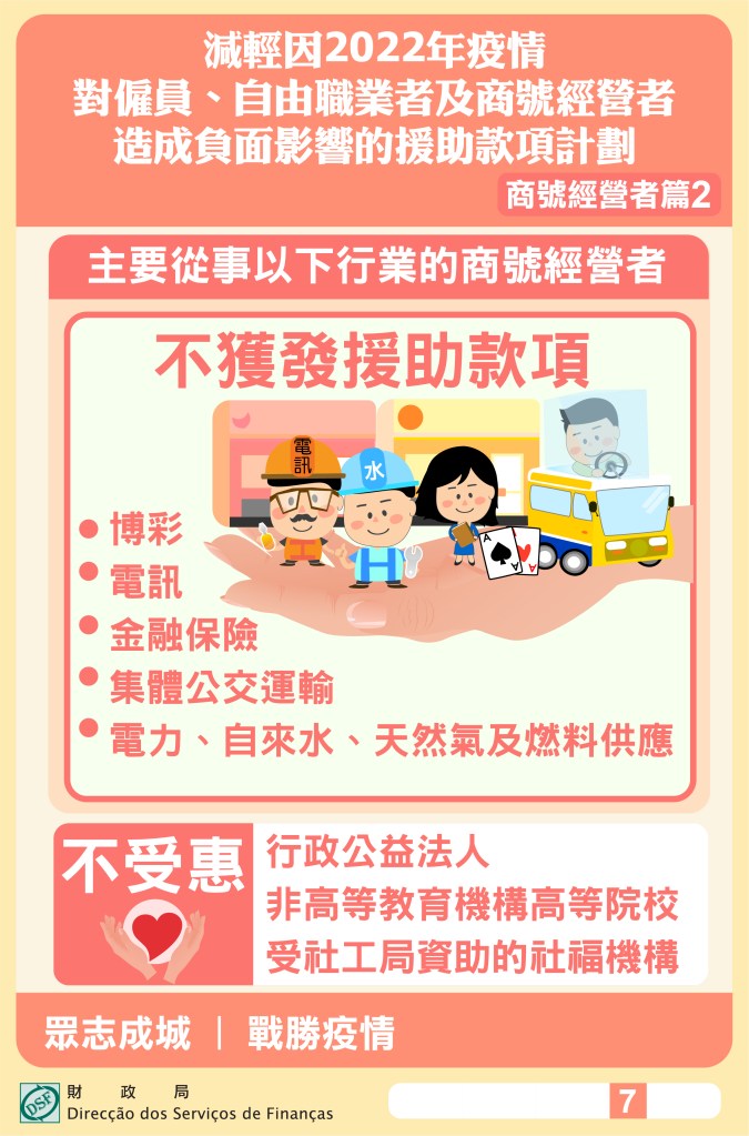 博彩、電訊、金融保險、集體公交運輸,以及電力、自來水、天然氣及燃料供應業等受專營或特許批給制度保障,又或獲政府資助的相關行業的經營者,連同一些性質較特殊的經營者,例如行政公益法人、教育機構(輔助教育除外),以及受社會工作局定期資助的社會服務機構,不納入是次援助計劃的受惠範圍。