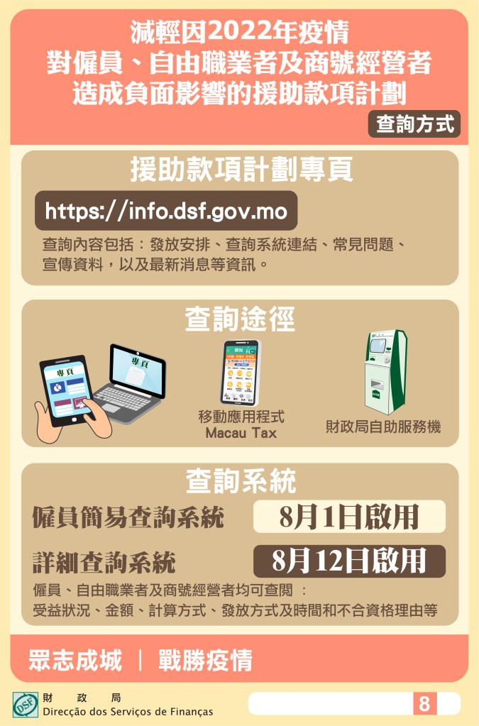 財政局於8月1日推出網上專頁(https://info.dsf.gov.mo),提供詳細的援助款項資訊,包括:發放安排、查詢系統、常見問題、宣傳資料及最新消息等。