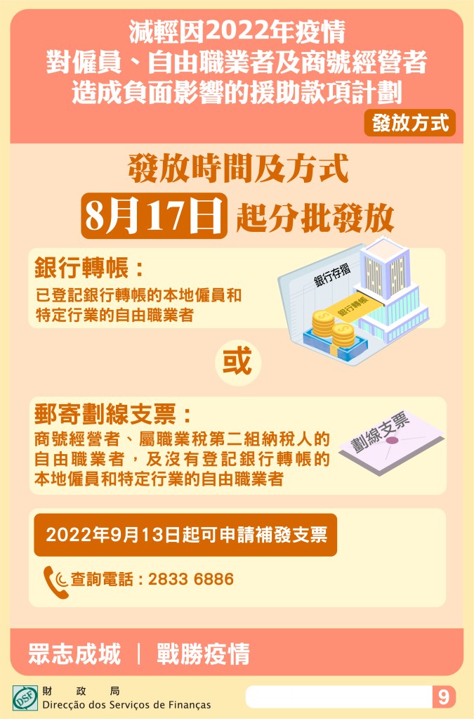 商號經營者、屬職業稅第二組納稅人的自由職業者,以及其他沒有登記以銀行轉帳方式收取援助款項的受益人,其援助款項將以郵寄劃線支票的方式發放,並於2022年8月17日起至8月29日分批寄送,財政局將於2022年9月13日起開始受理補發支票申請。