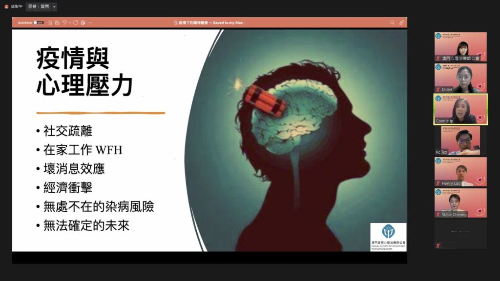 澳門註冊心理治療師公會舉辦《疫情下的精神健康》抗疫講座,邀請香港精神科醫生曹國柱和該會葉康妮註冊心理治療師分享疫情對精神健康的影響,以及如何穩定自己的身心健康,助社會更好地進入及後的疫情「穩定期」。講座有近百名參加者透過線上方式參與。
