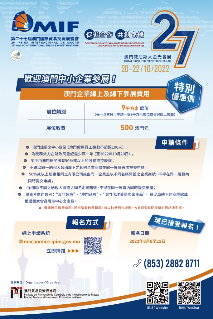 由澳門貿易投資促進局主辦的「第二十七屆澳門國際貿易投資展覽會」(第27屆MIF)將於2022年10月20至22日假澳門威尼斯人金光會展舉行。今屆MIF「澳門中小企業展區」展位增加一倍至160個,並為符合條件的澳門中小企提供特別優惠,以500澳門元參展,助力拓展商機。歡迎有意參與之企業由8月8至22日登入網上系統報名。