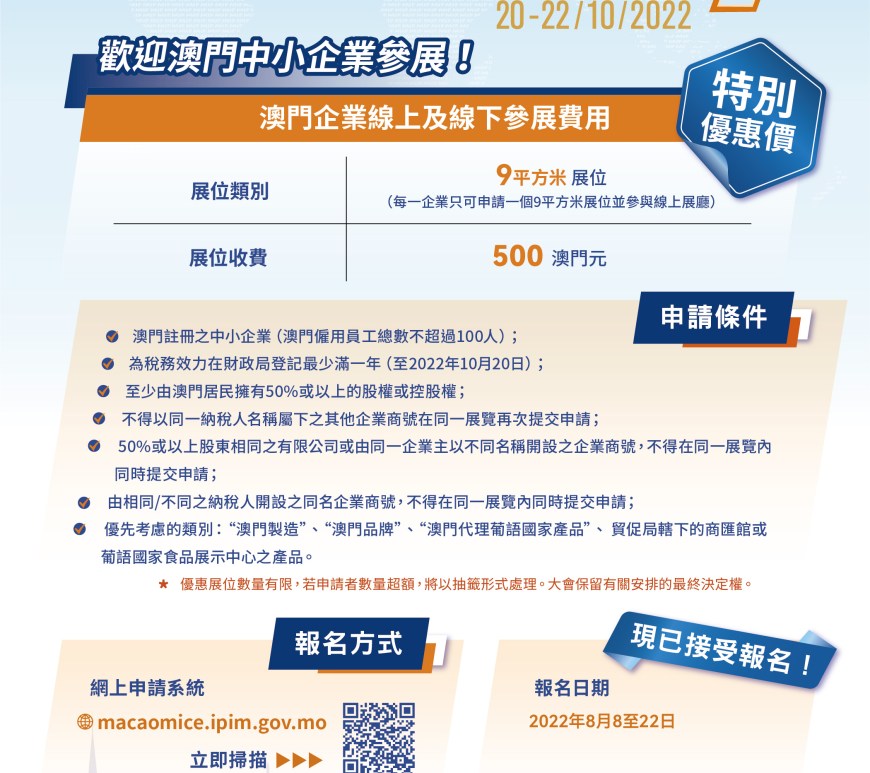 由澳門貿易投資促進局主辦的「第二十七屆澳門國際貿易投資展覽會」(第27屆MIF)將於2022年10月20至22日假澳門威尼斯人金光會展舉行。今屆MIF「澳門中小企業展區」展位增加一倍至160個,並為符合條件的澳門中小企提供特別優惠,以500澳門元參展,助力拓展商機。歡迎有意參與之企業由8月8至22日登入網上系統報名。