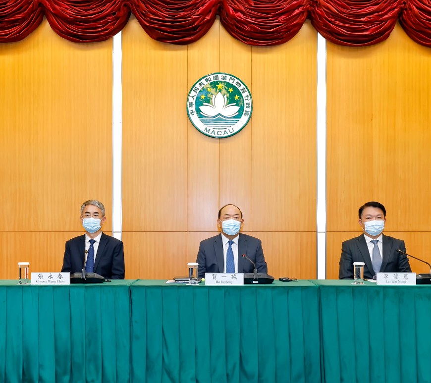 行政長官賀一誠日前率領行政法務司司長張永春、經濟財政司司長李偉農,在政府總部召開新聞發佈會,公佈中央支持澳門疫後經濟復甦、加快基礎設施建設,以及推動經濟適度多元發展等一系列惠澳措施。