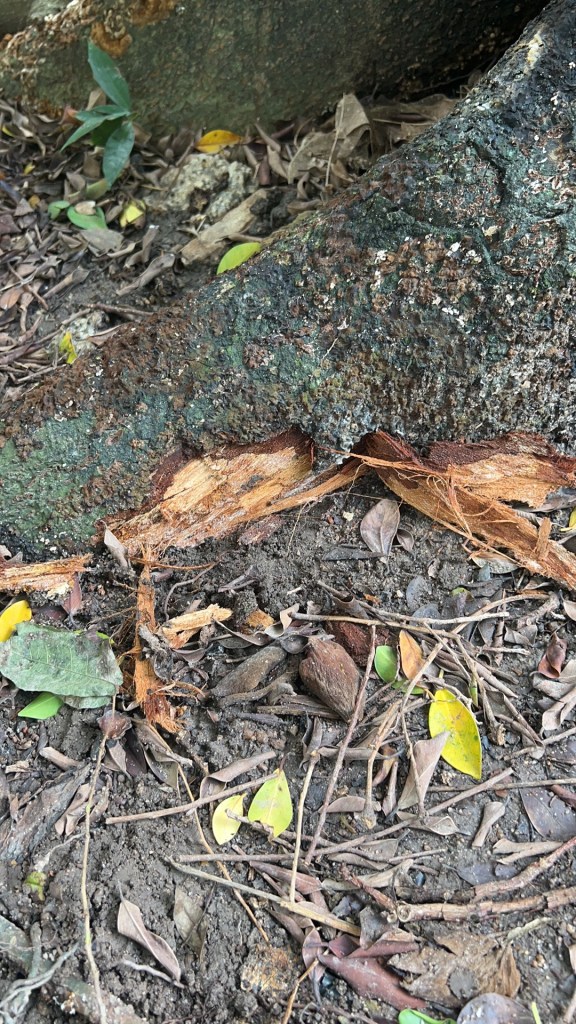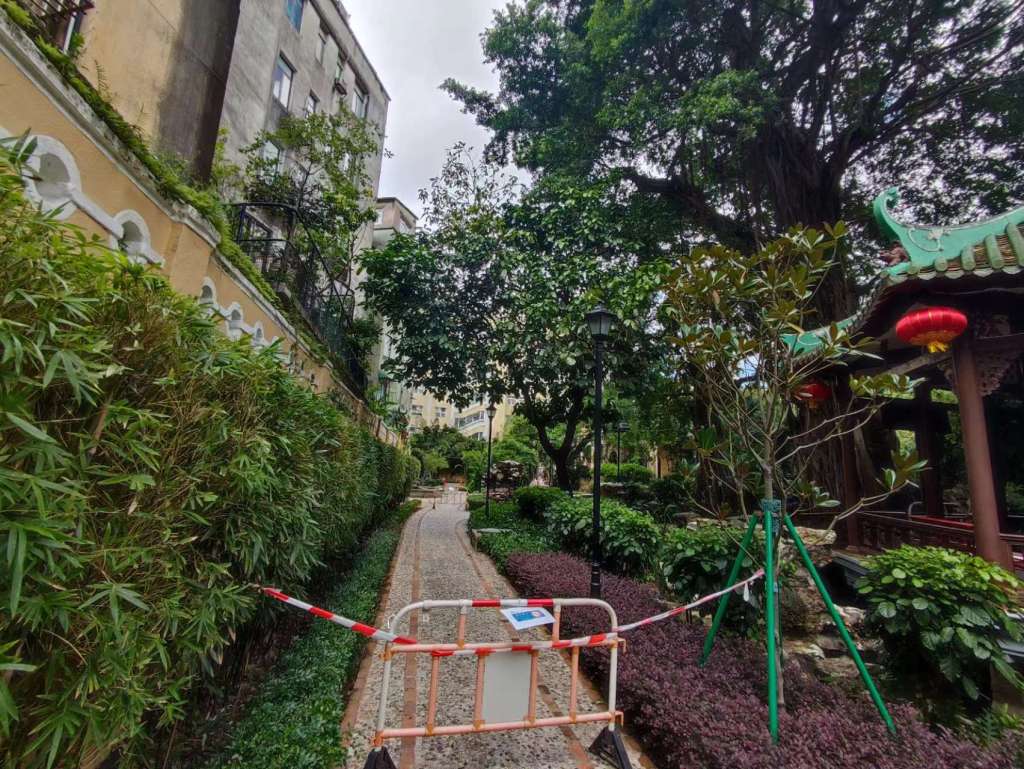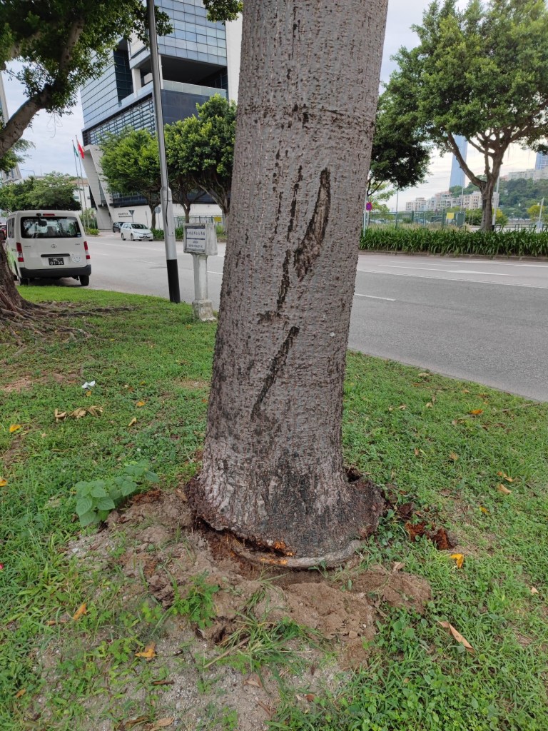 位於盧廉若公園的一株蘋婆樹根部範圍及整個樹基已感染病菌,並長出菌毯,經檢查,其木材結構鬆散,出現異常流膠現象,具有較高的倒塌風險,為確保園內遊人安全,有關區域已作圍封,將安排近日移除。