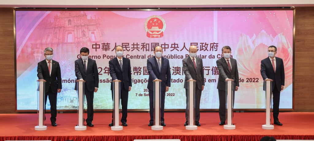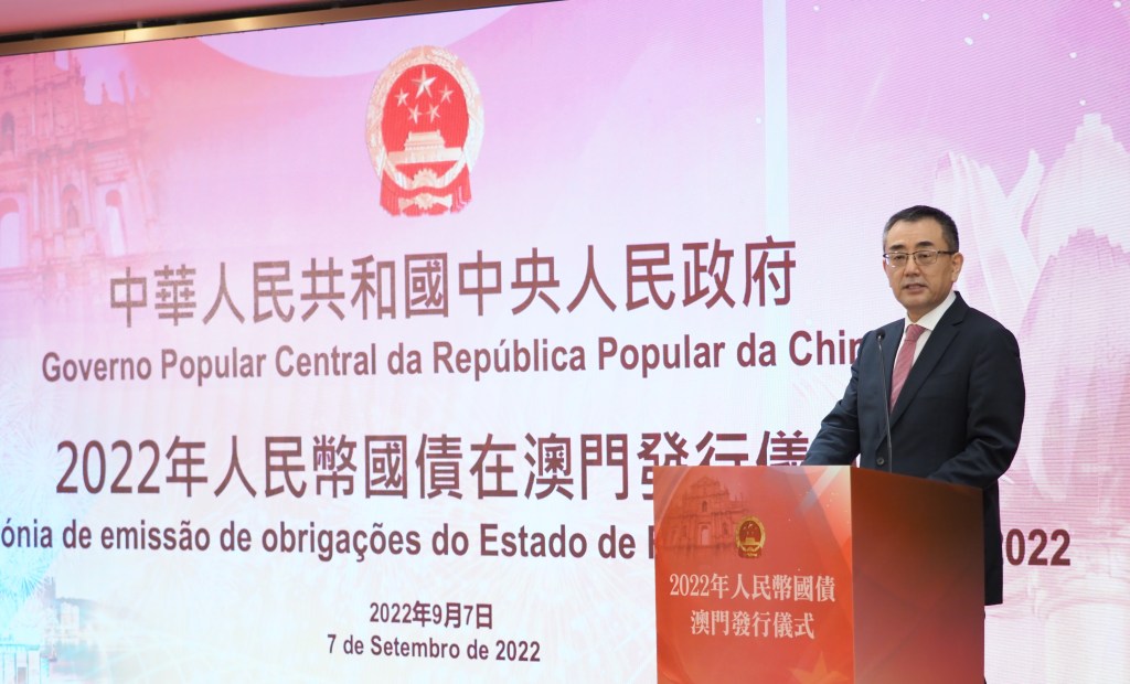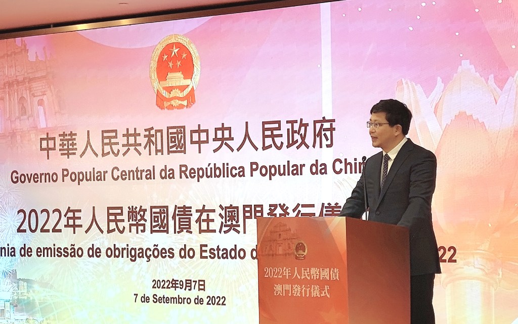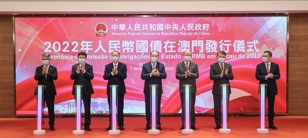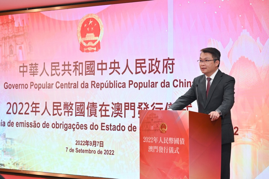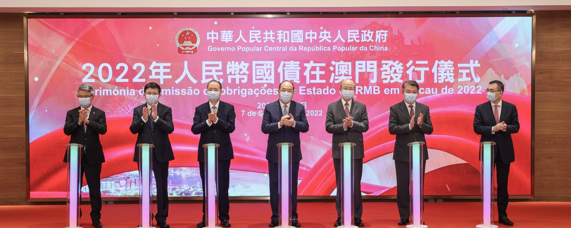 中央人民政府2022年人民幣國債在澳門發行儀式,日前在中國與葡語國家商貿合作服務平台綜合體舉行,行政長官賀一誠、中央政府駐澳門聯絡辦公室主任鄭新聰、外交部駐澳門特派員公署特派員劉顯法、國家財政部金融司司長王克冰、澳門經濟財政司司長李偉農以及相關金融機構代表出席了發行儀式。李偉農、王克冰、中國銀行副行長林景臻,以及交通銀行副行長郭莽在儀式上致辭。
