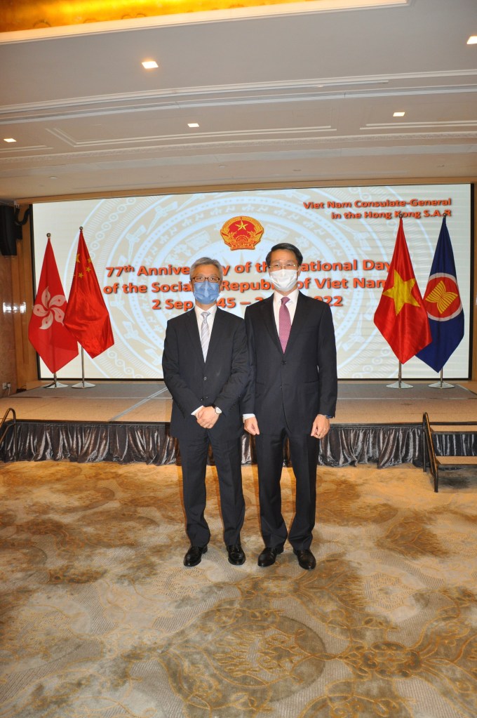 9月7日,越南駐香港和澳門總領事館隆重舉行越南國慶77周年紀念典禮。香港特別行政區政務司司長陳國基、香港特別行政區警務處處長鄧炳強等代表出席。