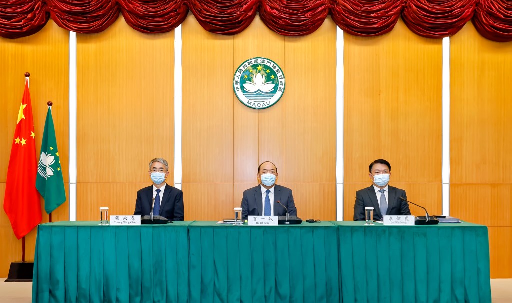 行政長官賀一誠日前率領行政法務司司長張永春、經濟財政司司長李偉農,在政府總部召開新聞發佈會,公佈中央支持澳門疫後經濟復甦、加快基礎設施建設,以及推動經濟適度多元發展等一系列惠澳措施。