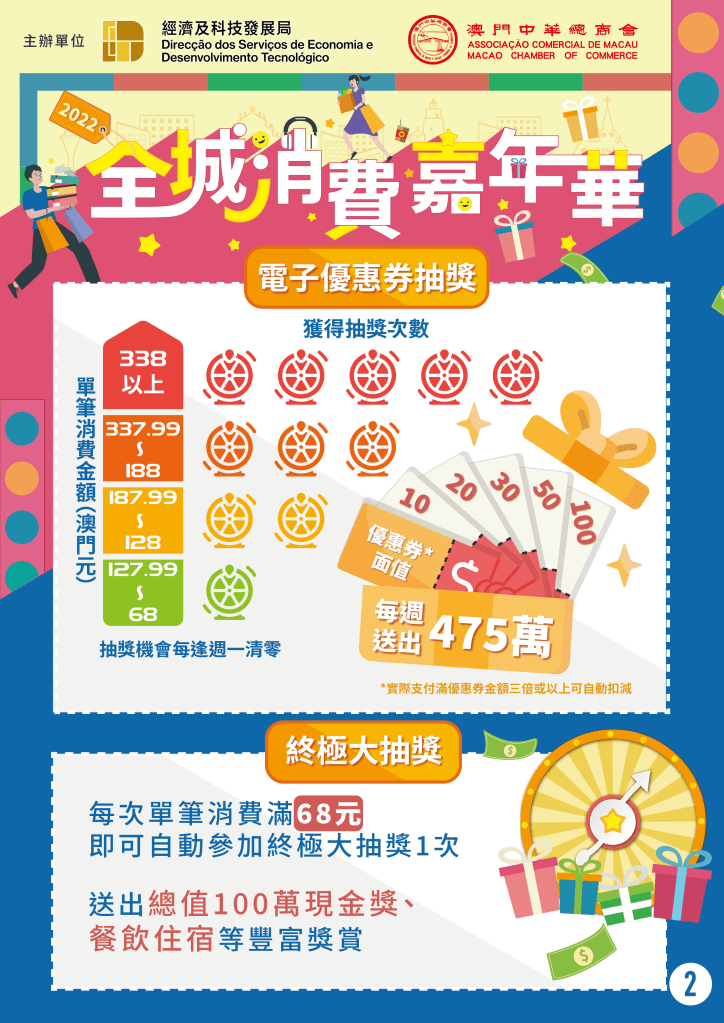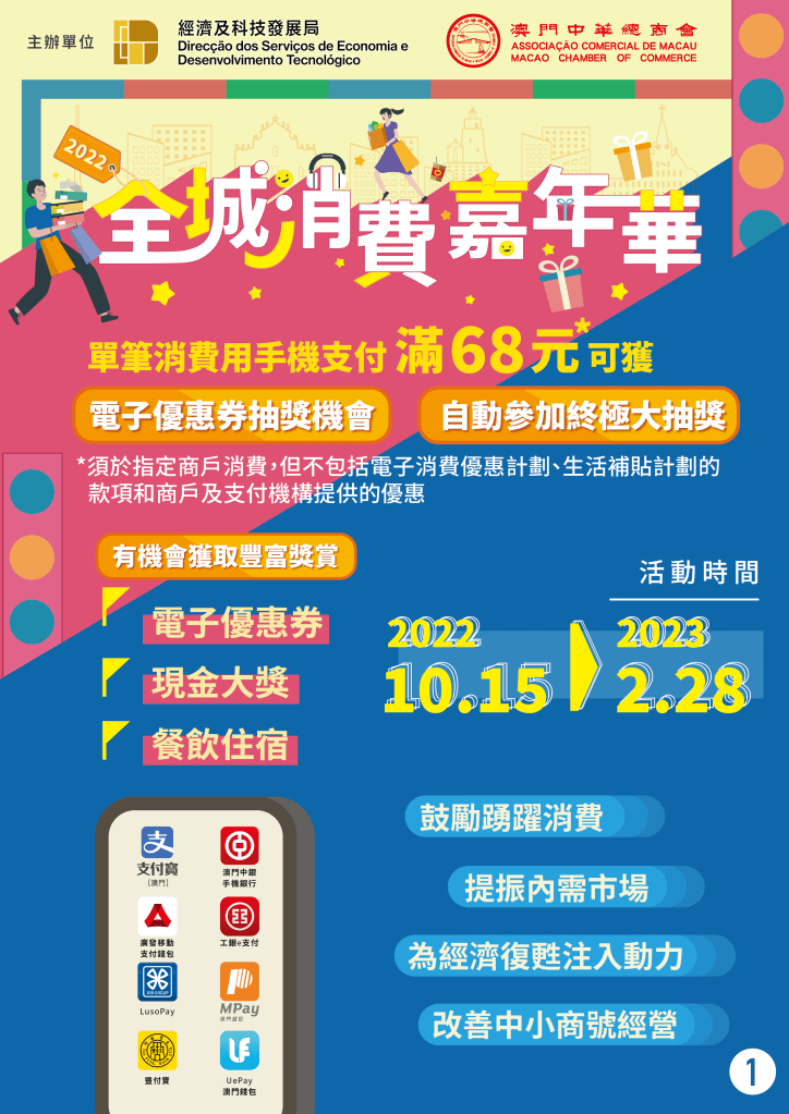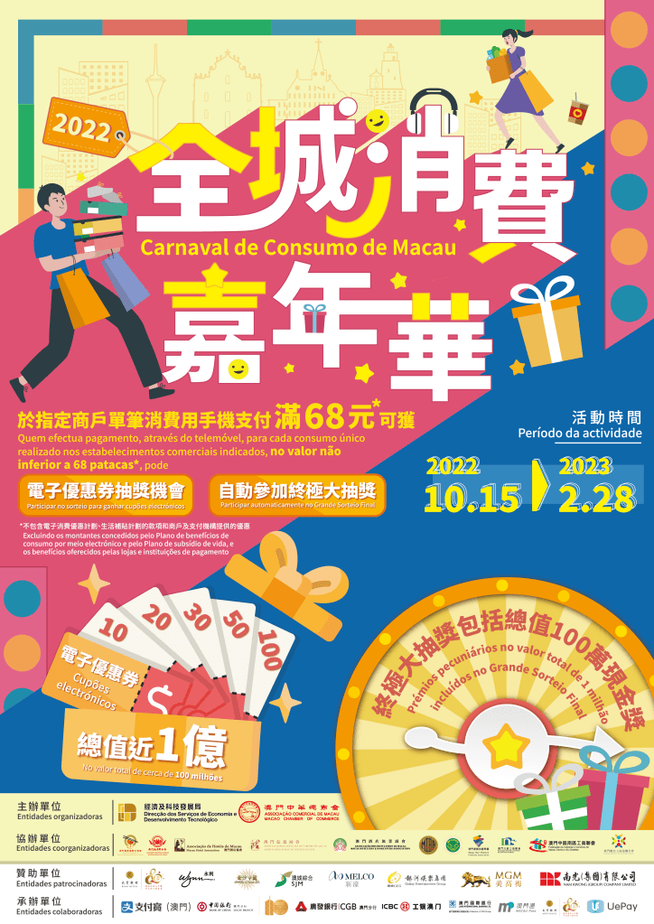 「2022年全城消費嘉年華」將於10月15日正式推出,直至明(2023)年2月28日,活動為期長達20週。活動獎金獎品總值近1億澳門元,活動期間,通過實名認證的電子錢包用戶於全澳線下大部分實體店舖消費時,透過移動支付單筆實付滿68元(澳門元,下同),即可獲得抽獎機會獲取電子優惠券,更可於活動結束後參加終極大抽獎。終極大抽獎獎品豐富,包括總值高達100萬元現金、餐飲住宿等。主辦單位期望,透過活動可刺激消費,擴大內需,改善市場氣氛,加強中小企業持續經營的信心,推動經濟復甦。