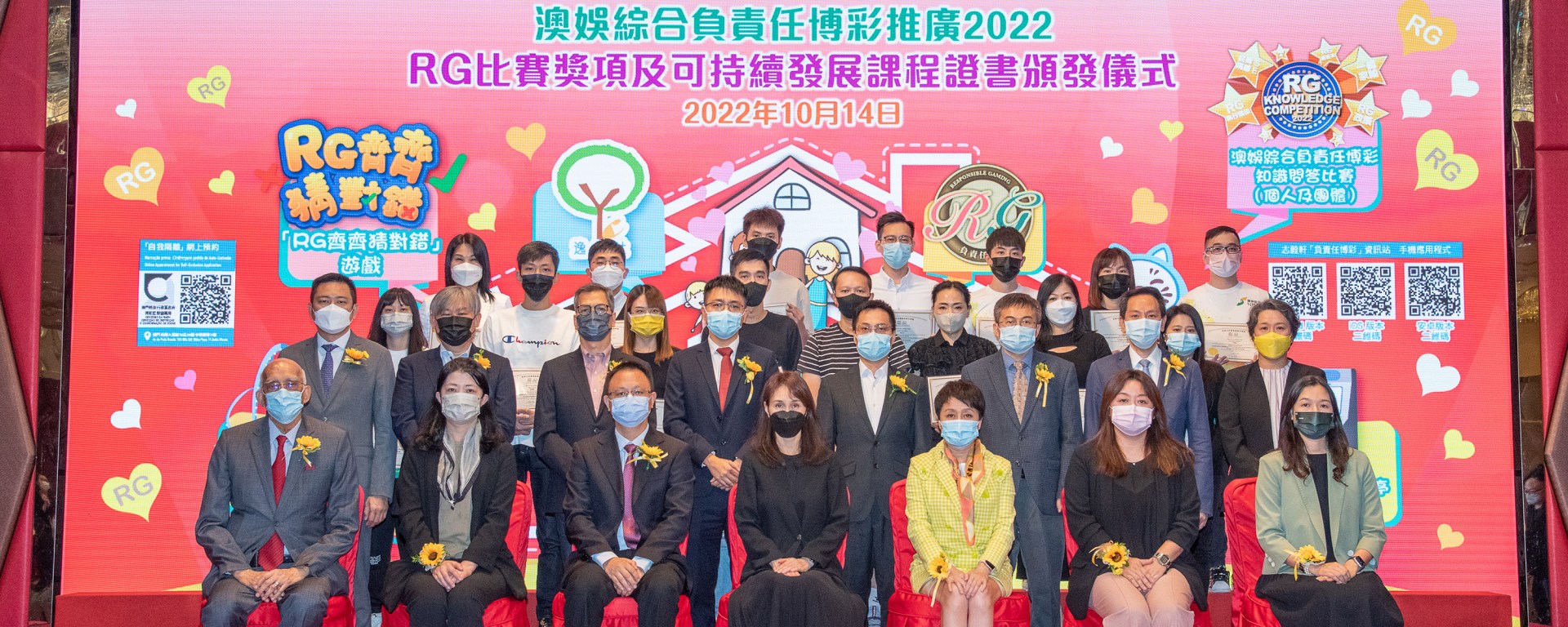 澳娛綜合負責任博彩(RG)推廣2022之RG比賽獎項及可持續發展課程證書頒發儀式日前假新葡京酒店宴會廳舉行,出席嘉賓包括中央人民政府駐澳門特別行政區聯絡辦公室經濟部楊毅副處長、澳門特區政府博彩監察協調局伍安璐女士、社會工作局防治問題賭博處代處長鄧詩敏女士、教育及青年發展局德育中心主任鄭雪珍、澳門工會聯合總會副理事長沈日光、澳門大學博彩研究所所長馮家超教授、澳門理工大學博彩旅遊教學及研究中心主任王長斌教授、澳門負責任博彩協會會長宋偉傑、聖公會澳門社會服務處服務總監李國豪、博彩業職工之家主任白建邦、逸安社理事長蕭宇康、香港可持續發展教育學院顧向恩教授,以及澳娛綜合常務董事何超鳳、董事梁安琪、秘書長官樂怡。
