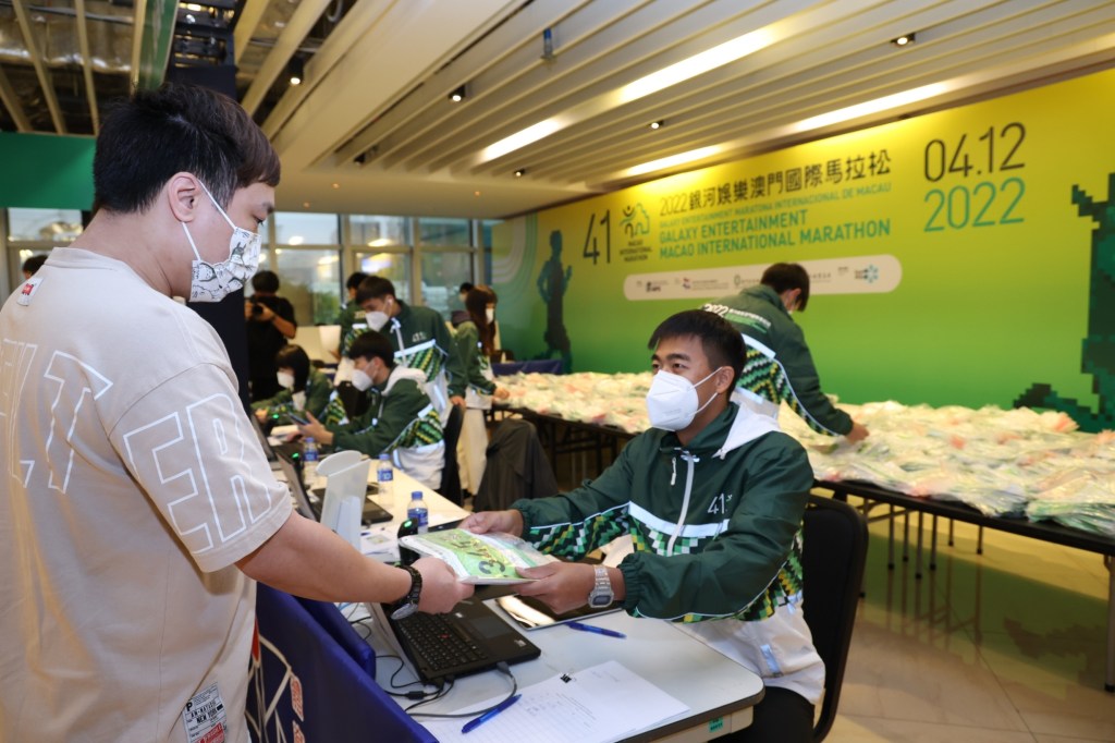 「2022銀河娛樂澳門國際馬拉松」的參賽者可由即日起至12月2日每日中午12時至晚上9時,以及12月3日中午12時至晚上10時,攜帶報名收據、身份證明文件及新型冠狀病毒疫苗接種證明(參賽者須於11月20日或之前完成初種系列全程接種)前往「澳門百老匯TM」M樓領取比賽號碼布及參賽者須知資料,同時組委會將向參賽者免費派發快速抗原檢測測試包。參賽者須注意領取號碼布時無須出示核酸檢測證明,而於比賽日參賽者須完成當天的自我快速抗原檢測,並持有24小時有效的核酸檢測陰性證明方可參賽。
