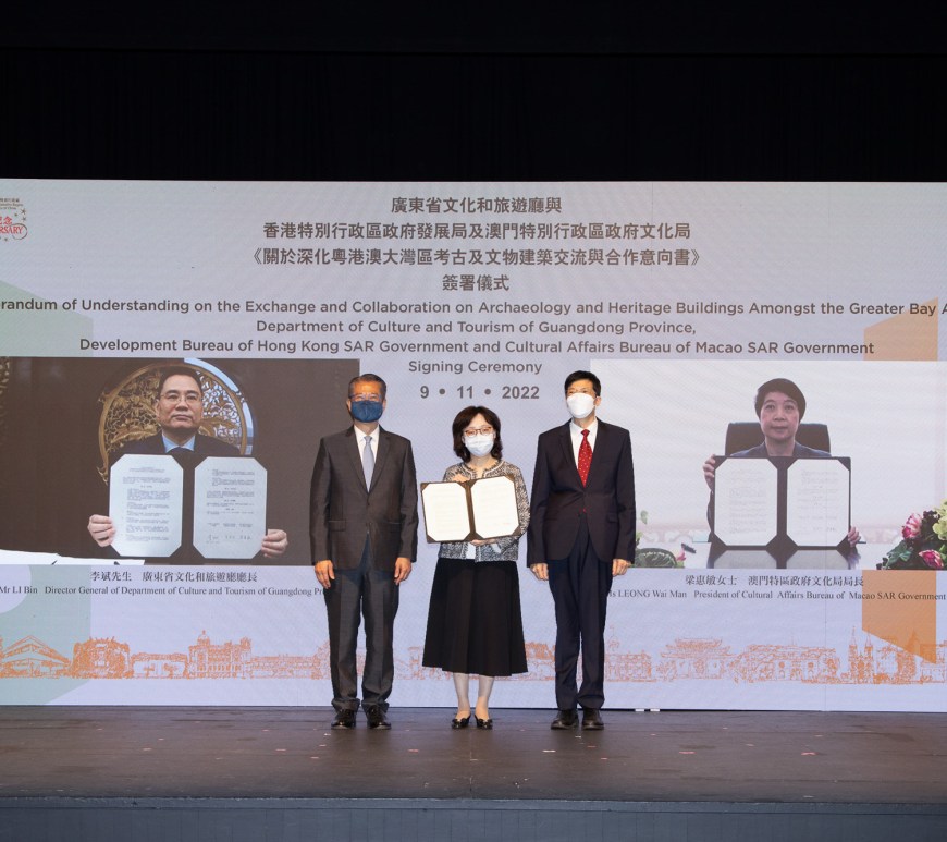 「大灣區文物建築高峯論壇」於11月9至10日在香港以線上線下結合方式舉行,澳門特別行政區政府文化局局長梁惠敏及文化遺產廳廳長蔡健龍應邀參加,並以線上方式參與會議,與香港特別行政區及大灣區九市專家代表進行交流。開幕禮上梁惠敏局長代表澳門文化局與香港發展局、廣東省文化和旅遊廳共同簽署《關於深化粵港澳大灣區考古及文物建築交流與合作意向書》,三方將加強粵港澳大灣區在考古和文物建築領域合作。