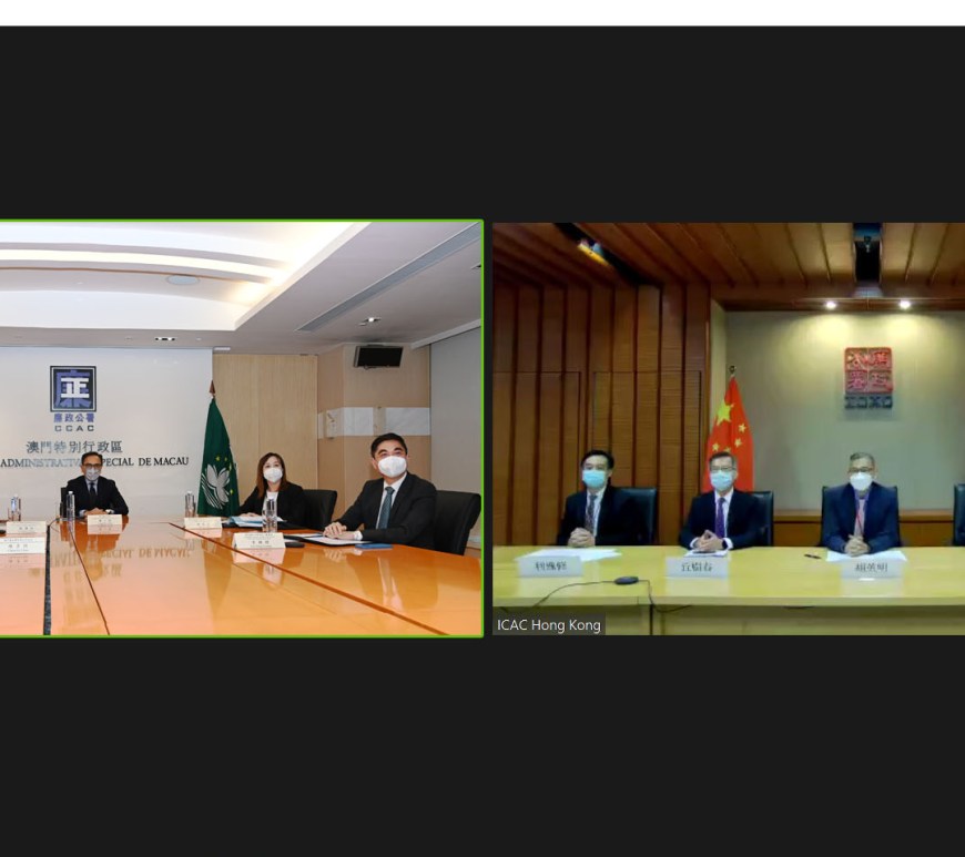 廉政專員陳子勁日前與香港廉政專員胡英明舉行視像會議,交流兩地廉政建設工作。陳子勁期望澳港兩地廉政公署能在反貪協查工作上繼續合作,並推動與內地建立三地司法互助。