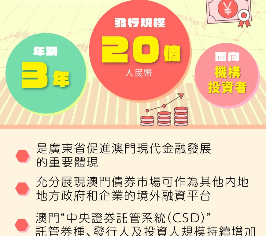 特區政府祝賀廣東省人民政府日前成功在澳門特區發行離岸人民幣地方政府債券,這是繼去年10月後,廣東省在澳門發行的第二隻境外人民幣地方政府債券,是澳門「中央證券託管系統(CSD)」首次託管地方政府債券,謹此感謝國家財政部、廣東省人民政府對澳門債券市場發展的支持。