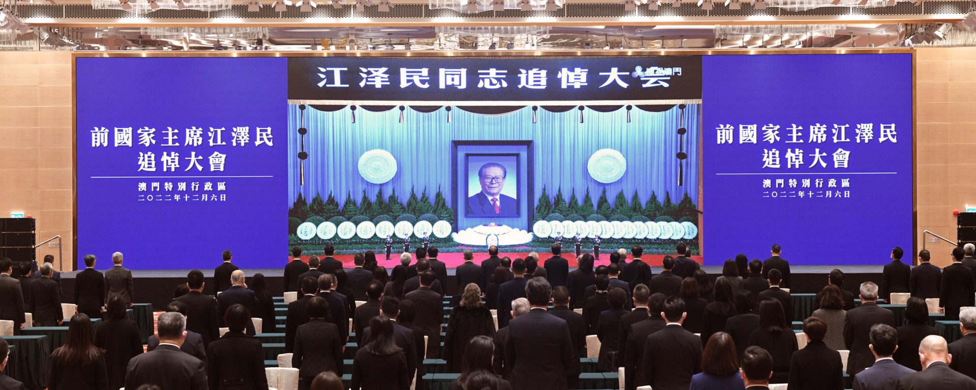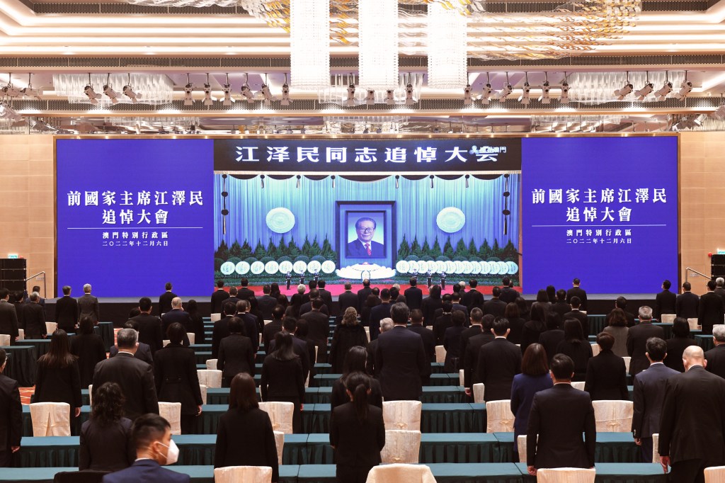 前國家主席江澤民追悼大會於12月6日上午10時在北京人民大會堂隆重舉行。為表達對前國家主席江澤民的深切哀悼,行政長官賀一誠率領全體特區政府官員,在中國與葡語國家商貿合作服務平台綜合體收看追悼大會現場直播及默哀。澳門各界也一同參與悼念活動。