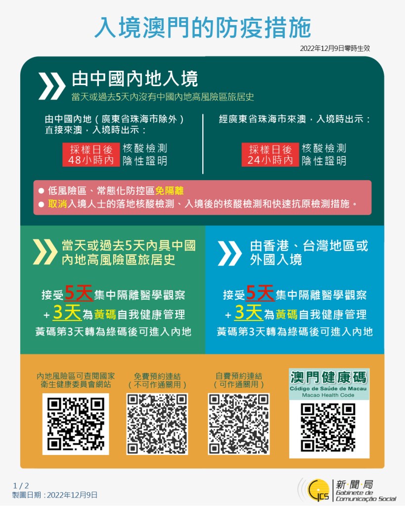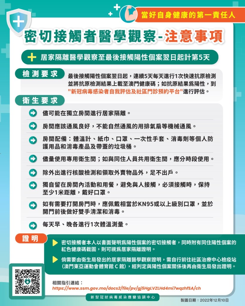 衛生局羅奕龍局長日前在新型冠狀病毒感染應變協調中心記者會表示,由12月14日起,正式進入過渡期的第二階段,推出感染者居家隔離治療措施,感染者居家隔離是有效分流感染者的措施,包括抗原陽性或核酸陽性人士,可透過電子平台進行「自我評估」,經評估後會有4個類別的結果,以不同顏色顯示。綠色:直接居家隔離治療;黃色:預約感染者社區門診;橙色:前往社區治療中心(澳門東亞運動會體育館)作進一步分流;紅色:由救護車送往仁伯爵綜合醫院特別急診治理。而評估內容包括年齡、基礎疾病、有否接種疫苗、臨床症狀及是否符合居家隔離治療條件等;此外,感染者的健康碼會被轉為紅碼,每日須通過平台申報健康狀況,當局會以電子方式提供醫生檢查證明,可直接使用「抗疫包」內的藥物,在有症狀時可按指引服用。隔離治療期間:首次陽性當天起計5天,最後2天抗原陰性後可解除隔離,倘若經評估後要到社區門診或社區治療中心需要經醫生評估(黃色或橙色分類),若判斷為有住院需要,按病情嚴重程度安排入住隔離治療酒店或醫院設施。而經醫生評估沒有住院需要,可進行居家隔離治療,但因個人特殊需要,可自行預約自費入住特定隔離酒店,按一般酒店標準收費。另一方面,感染者若可進行居家隔離治療,其同住人會被列為密切接觸者,健康碼會被轉為黃碼,須進行5天自我健康管理,若非必要儘量不外出,如因工作或其他原因外出時也應做好適當防護,儘量減少前往人多聚集的地方。