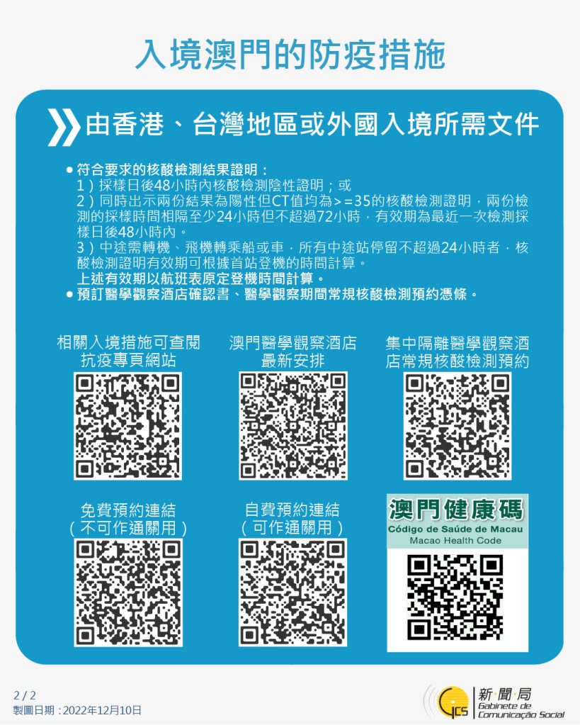 教育及青年發展局龔志明局長介紹自12月12日起試運轉的3個社區門診站點,開放時間為早上10時至晚上7時。此外,亦設有8個接載點,提供巴士供檢測呈陽性且未具條件自行前往社區治療中心(即澳門東亞運動會體育館)的居民乘搭。另外,教青局現正協調學校的抗疫包物資包裝及派送工作,由12月12日開始會首先派發小童(即3-6歲)的抗疫包,屆時學校將連同家長簽收回執發出,以確保家長收妥相關抗疫包。同日起,按照編排進行師生每周進行一次快測措施,以達至每天每班百分之二十的師生進行檢測篩查。除以上措施外,建議倘學生身體不適亦可再進行快測。倘有班內學生快測呈陽性,該班別停課五天,第六天上課前快測呈陰性,學生則可照常復課。