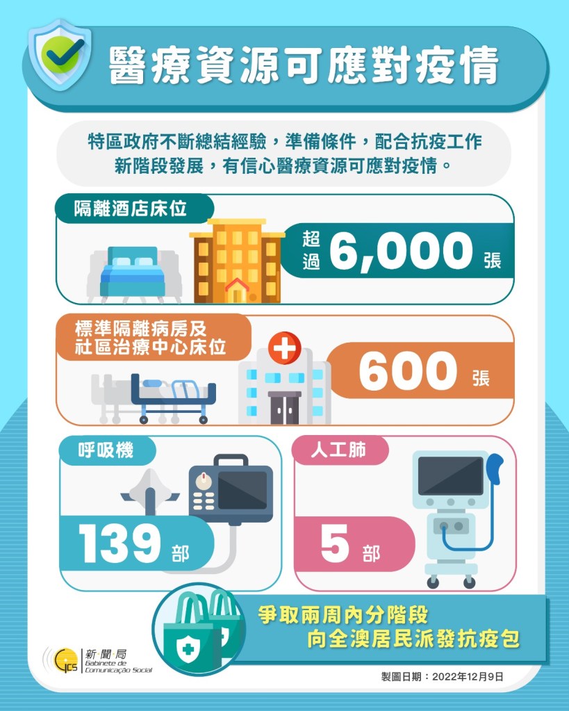 他指出,進入防疫政策過渡期第 2階段最重要是有效分流處理患者,感染 Omicron病毒的9成病人可能無症狀或發燒、咳嗽和喉嚨痛等,過程一般約5至7天,絕無住院需要。他又補充,該階段允許感染者居家治療,希望減少醫療資源壓力,以及維持社會正常運作。而居家隔離的感染者,當局會以電子方式發出為期5天的病假紙,呼籲各機構制定預案,以備機構內有大量工作人員感染後影響運作。此外,自12月10日起向幼稚園 3至 6歲的小朋友派發抗疫包,隨後向學校、公共部門、企業和機構員工派發,而其他居民會在社區設立的 20個站點領取抗疫包,爭取 2週內或更短時間內派發完成。