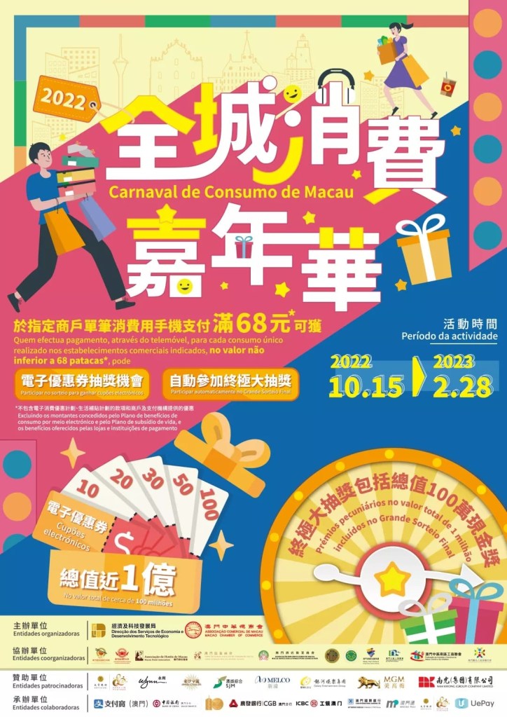為推動疫後經濟復甦,提振市場氛圍,經科局與澳門中華總商會合辦為期4個多月的大型促進消費活動「2022年全城消費嘉年華」。活動推出至今獲超過2.3萬間商戶參加,帶動二次消費額約9.4億元。期望透過送出電子優惠券以及獎品豐富的終極大抽獎,鼓勵居民多次消費,促進社區消費循環,提振疫後經濟復甦,加強各行各業持續經營的信心。