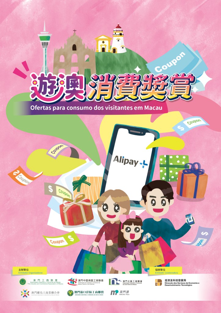 「遊澳消費獎賞」活動由澳門工商聯會、澳門中區南區工商聯會、澳門北區工商聯會、澳門離島工商業聯合會、澳門新口岸區工商聯會、澳門通以及Alipay+ 聯合主辦、經濟及科技發展局協辦。