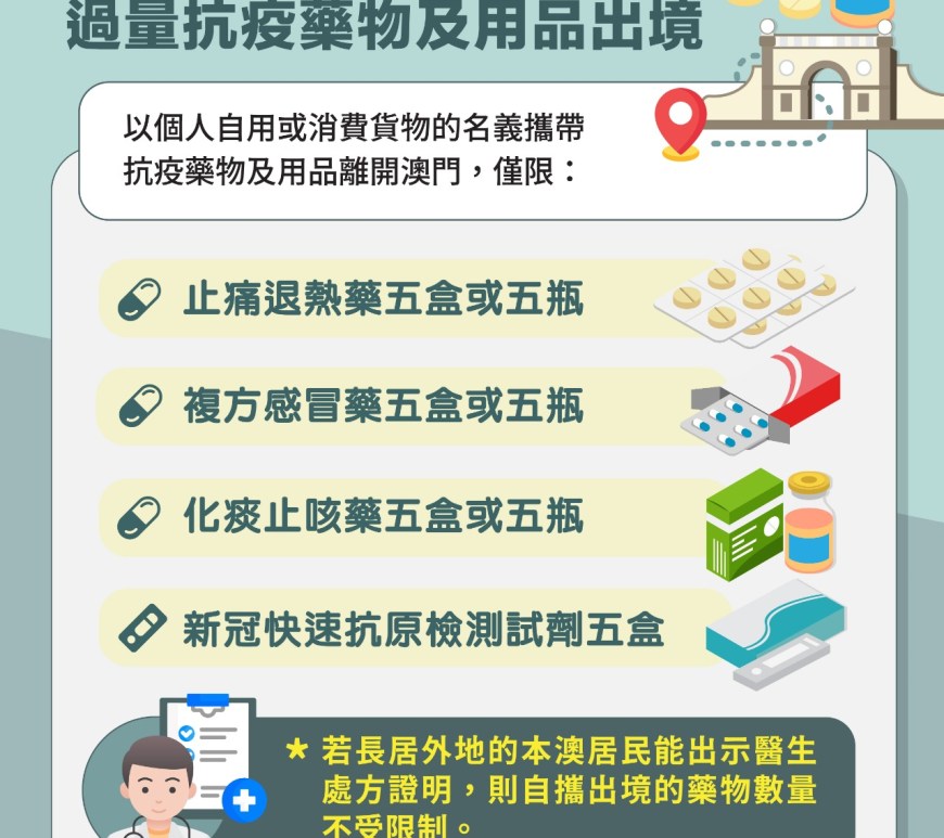 第3/2023號行政長官批示規定,由1月8日起禁止以個人自用或消費貨物的名義,限制止痛退熱藥五盒或五瓶、複方感冒藥五盒或五瓶、化痰止咳藥五盒或五瓶、新冠快速抗原檢測試劑五盒帶離澳門。