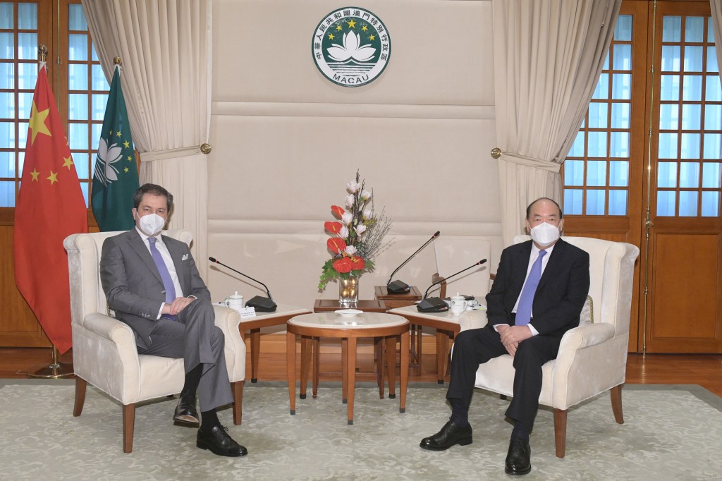 行政長官首先歡迎雷德生總領事來澳履新。他表示,中葡兩國始終保持良好關係,澳葡間的歷史淵源流長,亦令中葡之間的友好關係更為鞏固。一直以來,特區政府高度重視葡人社群的貢獻和傳承,致力保育其優良傳統、語言文化和生活習俗,尤其體現在法律、教育、建築、工程和新聞等方面。