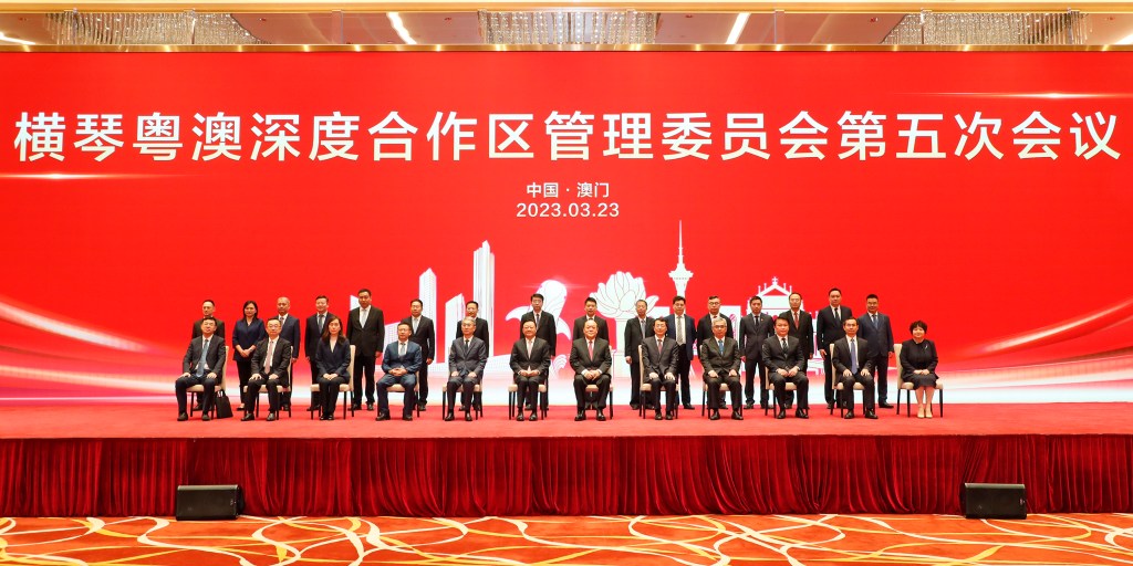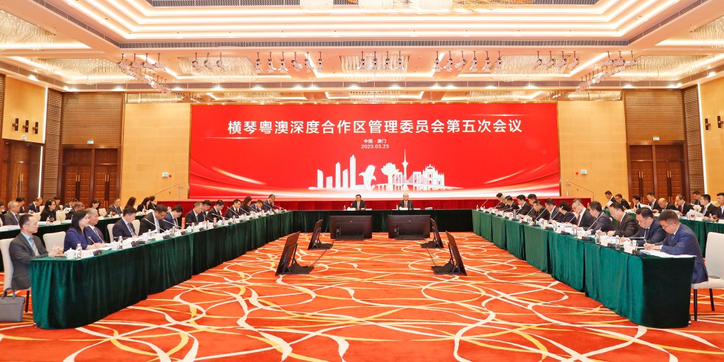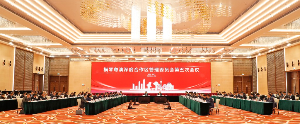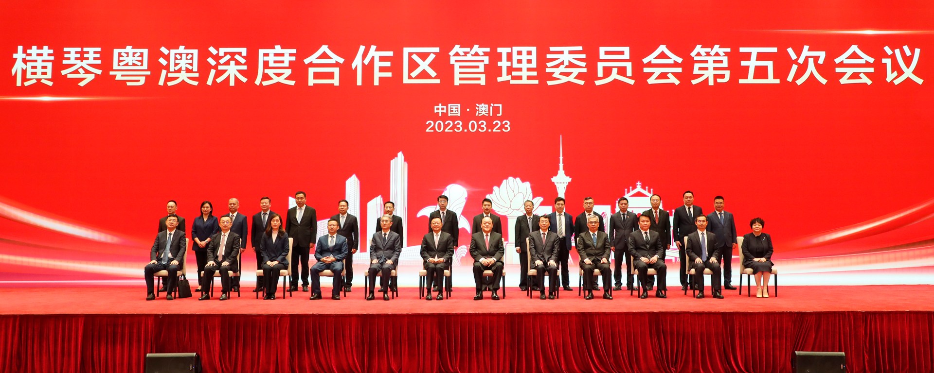 橫琴粵澳深度合作區管理委員會第五次會議於3月23日在澳門中國與葡語國家商貿合作服務平台綜合體舉行。會議由橫琴粵澳深度合作區管理委員會雙主任,澳門特別行政區行政長官賀一誠和廣東省省長王偉中共同主持。