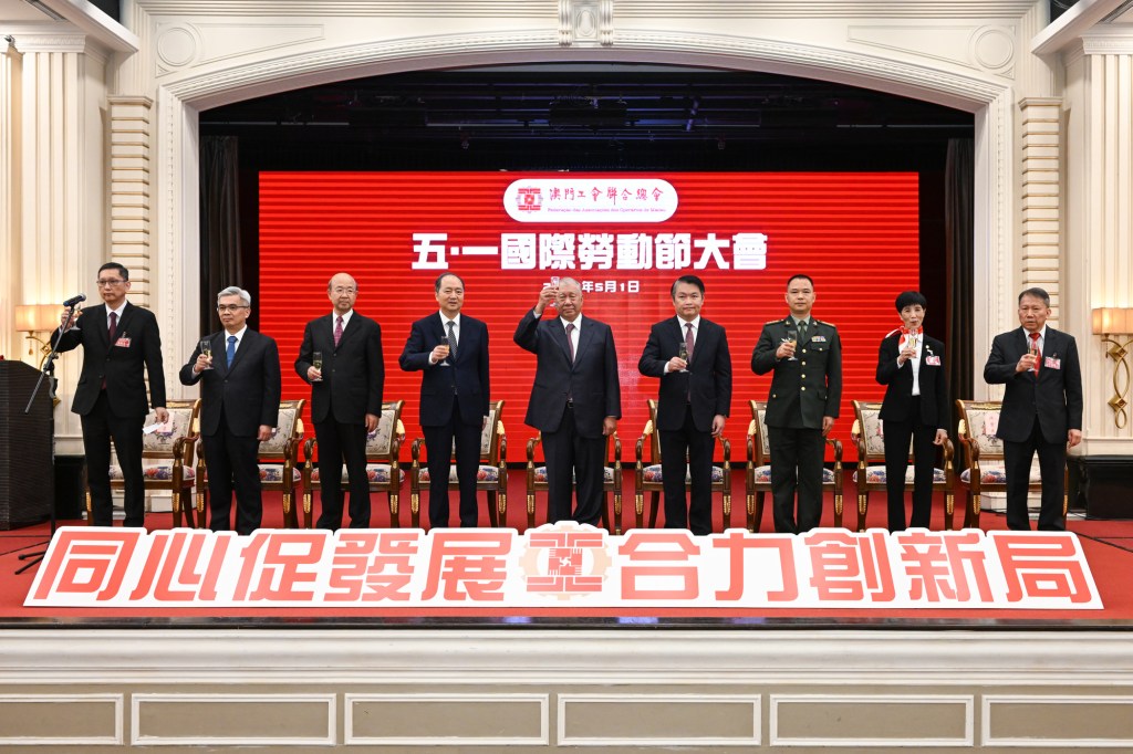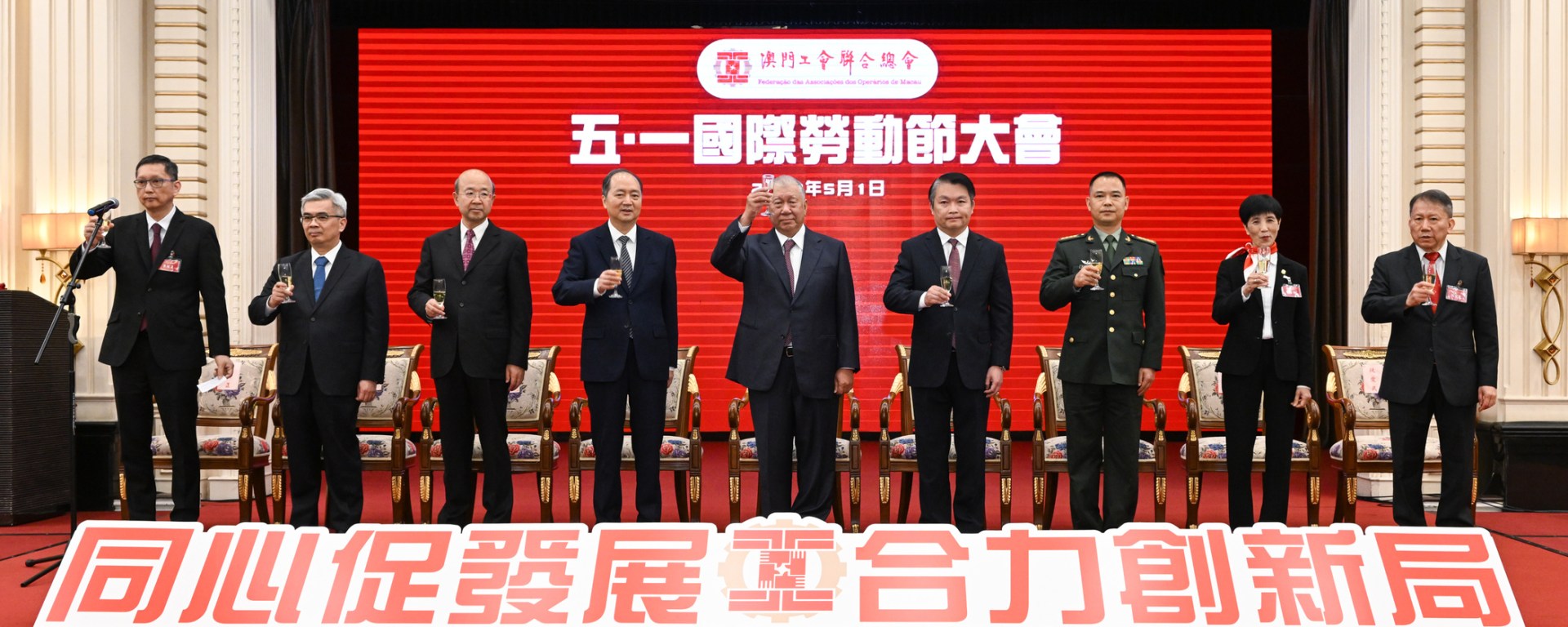 澳門工會聯合總會於五月一日下午四時假萬豪軒酒家舉行國際勞動節大會,全國政協副主席何厚鏵,中聯辦主任鄭新聰,行政長官代表、經濟財政司司長李偉農,外交部駐澳特派員公署特派員劉顯法,解放軍駐澳部隊副司令員戴勁松,保安司司長黃少澤,社會人士及嘉賓出席,氣氛熱烈。