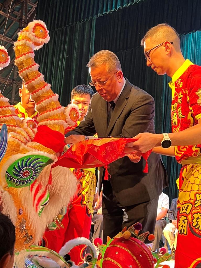 隨後,黃文生與該會常務副主席黃偉天、副主席張英、理事長陳愛蓮等陪同市政署市政管理委員會主席戴祖義、澳門基金會行政委員會委員何桂鈴、文化局文化遺產保護處處長何卓鋒、旅遊局旅遊產品處處長葉穎珊、立法議員梁安琪、文化遺產委員會委員陸南德、太陽餐飲集團有限公司執行董事周瑞卿、百齡集團投資發展有限公司董事長賴百齡、東星國際發展集團主席Bella及嘉賓鄧慧儀、葉達、岑玉霞、胡車賢、黃耀武、黃耀東、吳華威、敖永安、方鈞鋒、侯榕根、陳鍵銓、楊景開、趙成蔚、劉志輝、梁殷銘、蔡永強、盧卓明。何力輝、林壘立、劉國熙、溫秀紅、黎錦發、陳國康、黃偉傑、陳健華、龔雄、薛啟善、溫嘉豪、林凱澤、朱瑞玲、李錦銳、麥炳耀、鄧惠蓮、張大文、梁銘思、馮子建、冼金松、胡偉全、梁杏笑、伍超雄、梁冠峰、林就、馮德祥、歐穎剛、曾華壤、陳量、楊兆麟、張朝發、麥達民、郭克敏、戴寶蓮、陳源光等主持金龍、醒獅簪花掛紅、點睛、灑淨及鳴炮儀式,以及向永遠名譽主席、名譽主席頒贈聘書。路環街坊四廟慈善會體育會龍獅表演助興,場面熱鬧。