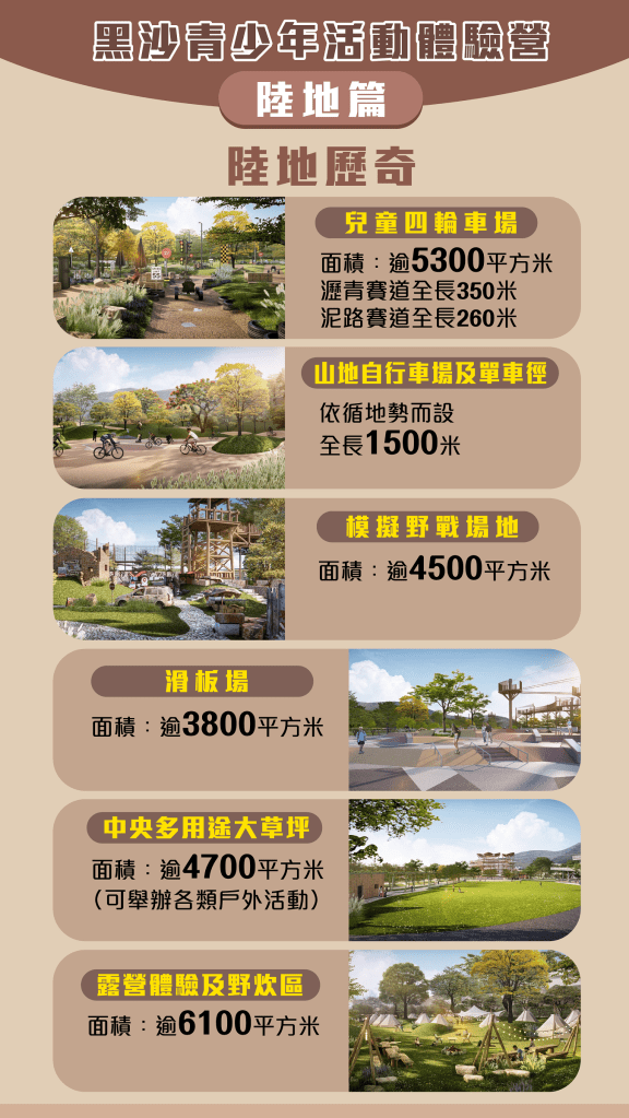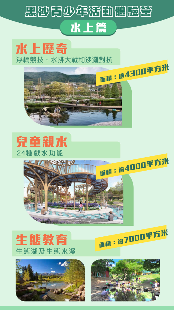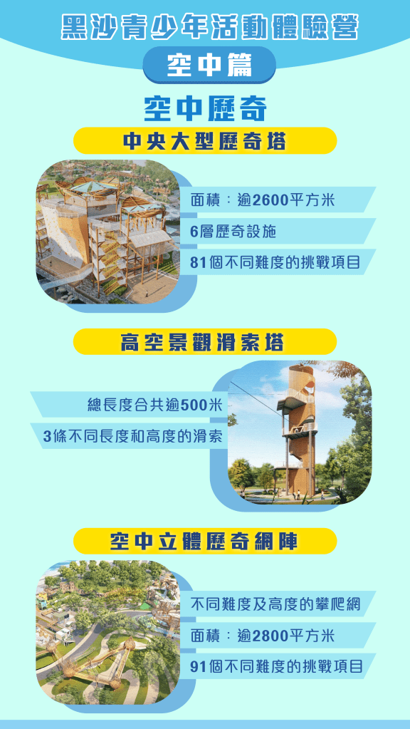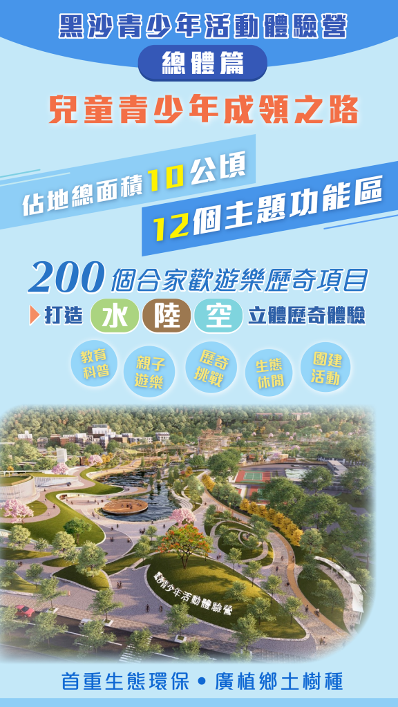 黑沙青少年活動體驗營佔地總面積10公頃,除設12個主題功能區、逾200個「水、陸、空」遊樂歷奇項目外,亦建設防洪排澇基建、停車場、活動中心、餐飲空間等一系列配套設施,打造全澳乃至鄰近地區規模最大的歷奇營地,為全澳居民,尤其是兒童、青少年提供「水、陸、空」立體歷奇體驗。