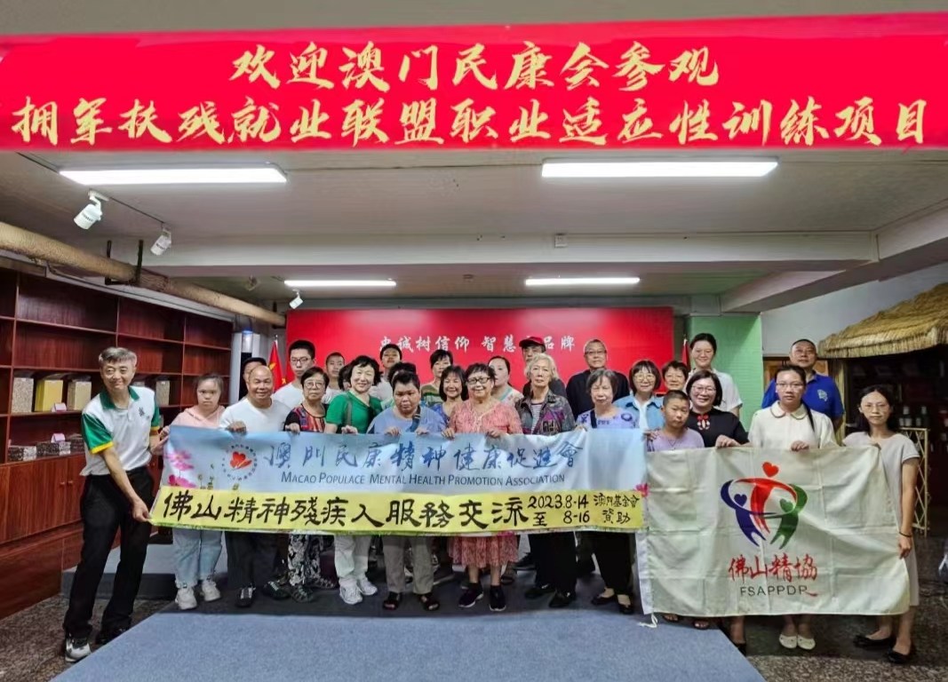 為促進大灣區復康機構的交流互動,澳門民康精神健康促進會得到澳門基金會資助,於8月14至16日到訪佛山市精神殘疾人親友協會。參與的民康會理監事和熱心會員一共20人,受到佛山市精協會長鍾波和專程由廣州到來參與交流的省精協會長張蘭香、秘書長孔月筠等領導熱情接待。雙方首先介紹自助組織的歷史、提供的各種服務和遇到的困難,相比於廣州市精協來說,成立只有兩年的佛山精協可算是相當年青,他們表示遇到最大的困難是市民對精神病患者的污名化觀念較為嚴重,民康會總幹事羅耀祖表示,其實經澳門同工多年來的努力,可算是有一點成績,但畢竟,污名觀念仍根深蒂固,同路人們還須不斷努力。民康會介紹了他們的一些經驗供佛山精協參考,例如,民康會的公開活動照片從來都不會將參與者的面容打馬賽克,遮掩的原意是為了保護相關人士,但其實是一種軟性傷害,相關人士與一般市民會永遠被一條鴻溝阻隔,難以融合。民康會亦感受到中央政府對復康團體的支持力度不斷加大,關懷越趨細緻。佛山精協的努力感動了當地一家退伍軍人俱樂部,讓他們分享活動場地和設施,民康會一行參觀了這其中的愛心工場,體驗資源共享的靈活構思。