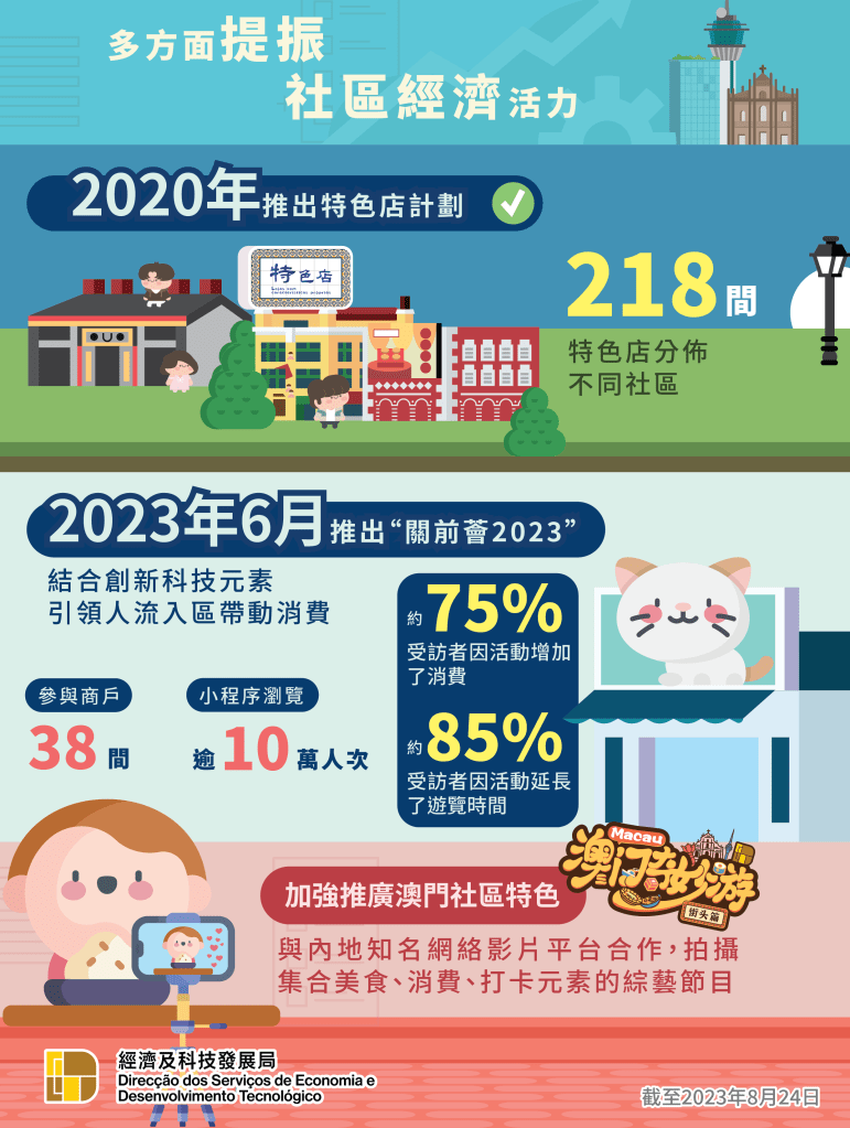 經科局與地區商會合作自2020年推行「特色店計劃」,至今共有218間企業獲認可為特色店,並分佈在不同社區。並持續以多媒體、多渠道,線上線下為特色店推廣宣傳。今年6月,與商會合作開展「抖音」網紅達人宣傳計劃,為特色店進行探店種草及視頻分享。