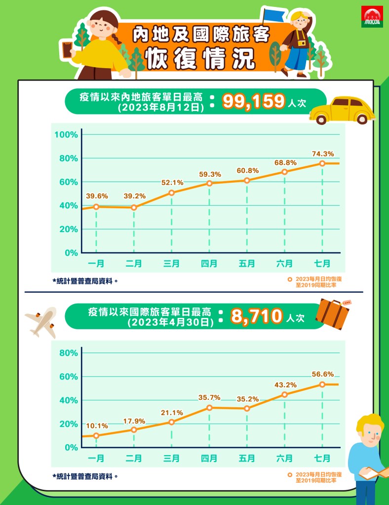 澳門入境旅客方面,統計暨普查局最新公佈,今年1至7月入境旅客累計錄得1,440.5萬人次。7月訪澳旅客情況理想,日均入境旅客恢復至疫情前2019年同期78.2%,其中,內地旅客7月日均人次恢復至2019年同期74.3%。暑假旅遊旺季,訪澳旅客進一步增加,根據臨時數據,8月12日錄得13.9萬人次,創今年以來最高單日入境人次,也是3年半以來最高。