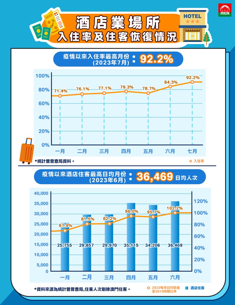 酒店業場所入住數據方面,今年6月入住酒店業場所的日均旅客超過3.6萬人次,6月日均恢復至2019年同期比率達102.2%。此外,7月酒店業場所入住率達到92.2%,達到疫情以來最高。