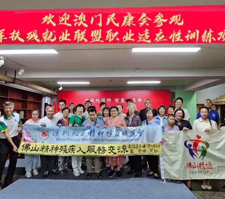 為促進大灣區復康機構的交流互動,澳門民康精神健康促進會得到澳門基金會資助,於8月14至16日到訪佛山市精神殘疾人親友協會。參與的民康會理監事和熱心會員一共20人,受到佛山市精協會長鍾波和專程由廣州到來參與交流的省精協會長張蘭香、秘書長孔月筠等領導熱情接待。雙方首先介紹自助組織的歷史、提供的各種服務和遇到的困難,相比於廣州市精協來說,成立只有兩年的佛山精協可算是相當年青,他們表示遇到最大的困難是市民對精神病患者的污名化觀念較為嚴重,民康會總幹事羅耀祖表示,其實經澳門同工多年來的努力,可算是有一點成績,但畢竟,污名觀念仍根深蒂固,同路人們還須不斷努力。民康會介紹了他們的一些經驗供佛山精協參考,例如,民康會的公開活動照片從來都不會將參與者的面容打馬賽克,遮掩的原意是為了保護相關人士,但其實是一種軟性傷害,相關人士與一般市民會永遠被一條鴻溝阻隔,難以融合。民康會亦感受到中央政府對復康團體的支持力度不斷加大,關懷越趨細緻。佛山精協的努力感動了當地一家退伍軍人俱樂部,讓他們分享活動場地和設施,民康會一行參觀了這其中的愛心工場,體驗資源共享的靈活構思。