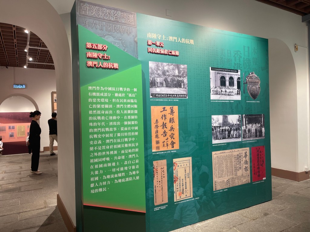 此次展覽中,澳門口述歷史協會的團隊根據對澳門民眾抗戰歷史的最新研究成果,特別推出了「南陲守土 澳門人的抗戰」作為展覽的特色內容。團隊從海量的澳門抗戰文物圖片中精選了40多幅歷史圖片,從「同仇敵愾救亡賑難」「共赴國難熱血奉獻」兩部分展現當年澳門同胞與祖國同呼吸共命運的抗戰風貌。