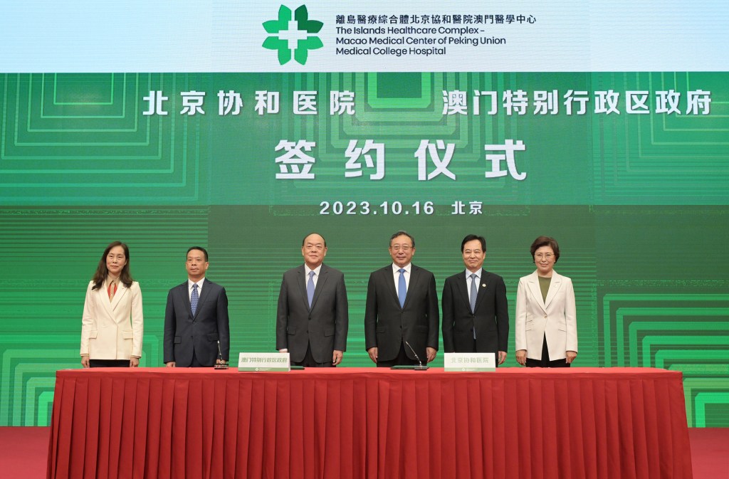 2023年10月16日,在澳門特別行政區行政長官賀一誠,國家衛生健康委副主任曹雪濤,澳門中聯辦副主任黃柳權,北京協和醫院名譽院長、離島醫療綜合體北京協和醫院澳門醫學中心策略發展委員會主席趙玉沛共同見證下,澳門特別行政區政府社會文化司司長歐陽瑜與北京協和醫院院長張抒揚簽署《離島醫療綜合體北京協和醫院澳門醫學中心運營合作協議》。