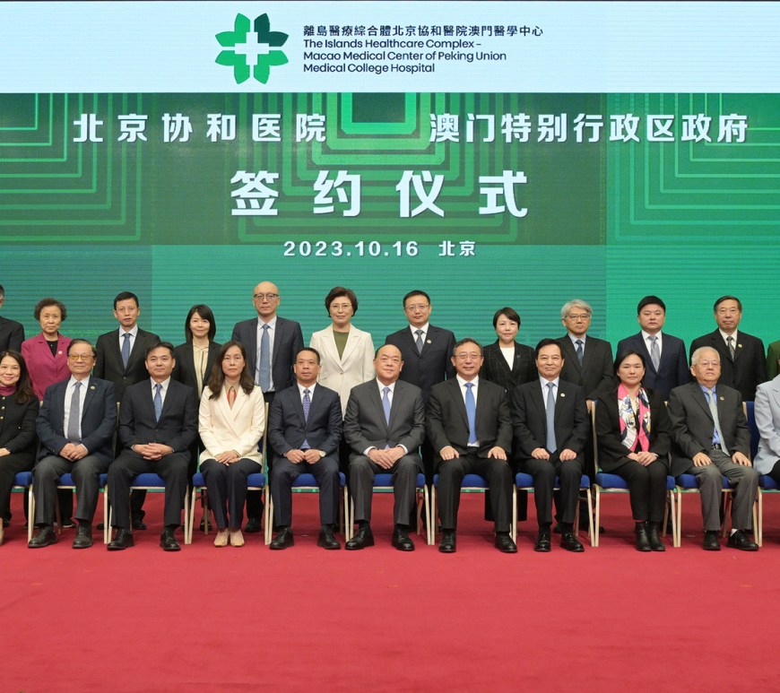 2023年10月16日,在澳門特別行政區行政長官賀一誠,國家衛生健康委副主任曹雪濤,澳門中聯辦副主任黃柳權,北京協和醫院名譽院長、離島醫療綜合體北京協和醫院澳門醫學中心策略發展委員會主席趙玉沛共同見證下,澳門特別行政區政府社會文化司司長歐陽瑜與北京協和醫院院長張抒揚簽署《離島醫療綜合體北京協和醫院澳門醫學中心運營合作協議》。