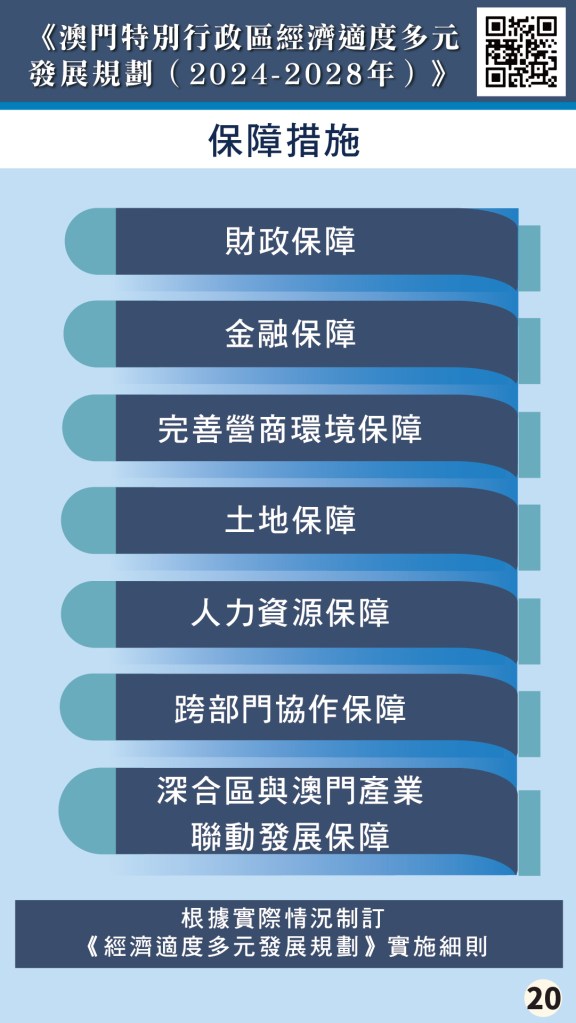 《澳門特別行政區經濟適度多元發展規劃(2024-2028年)》是澳門特區首個全面系統的產業發展規劃,是澳門特區政府貫徹落實中央要求,做好經濟適度多元發展這個必做題的重大綱領性文件。特區政府將團結帶領社會各界,以規劃為引領,凝心聚力謀發展,排除萬難促多元,以更大作為加快推動澳門經濟適度多元和高質量發展,開創澳門更加美好的未來!