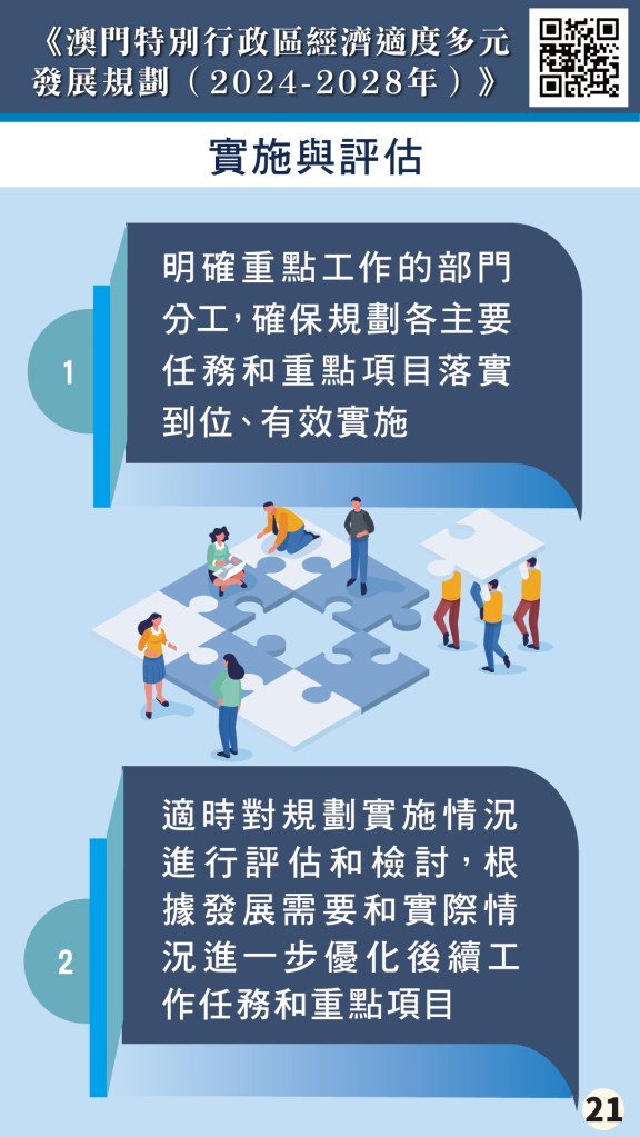 在全面對接國家「十四五」規劃、《粵港澳大灣區發展規劃綱要》的基礎上,特區政府以「二五」規劃和「1+4」經濟適度多元發展策略為依據,堅持問題導向,立足澳門實際,編製《澳門特別行政區經濟適度多元發展規劃(2024-2028年)》。規劃提出2024至2028年經濟適度多元發展的具體目標、主要任務和重點項目,引導社會投資方向及居民發展方向,從政策、人力、財力等方面多管齊下,聚力攻堅,積極促進發展新的產業,培育新的經濟增長點,鞏固和提升傳統優勢產業,進一步增強產業之間的協同發展效應,切實增強澳門經濟的發展動能和綜合實力,加快推動澳門經濟適度多元、可持續和高質量發展。