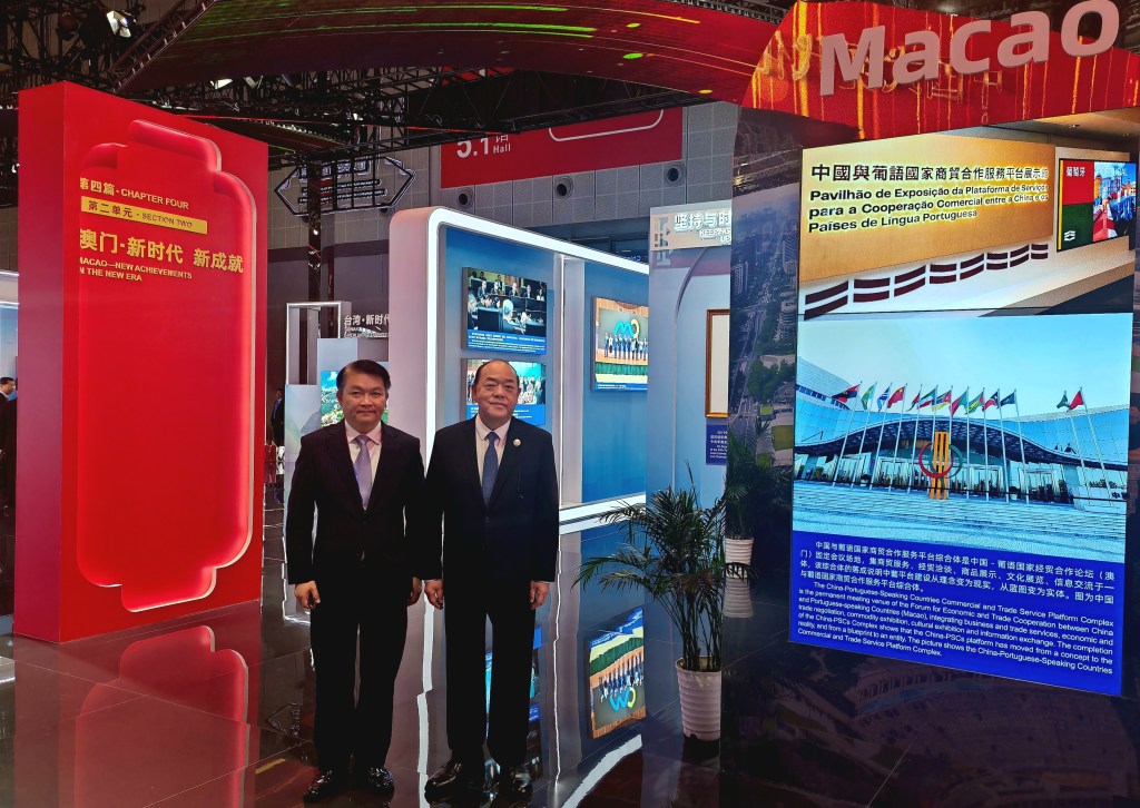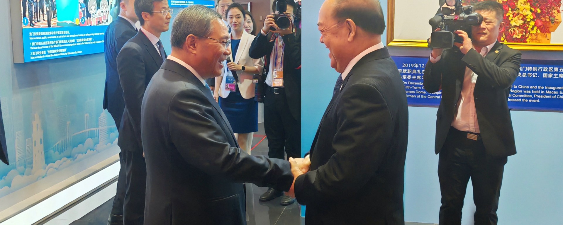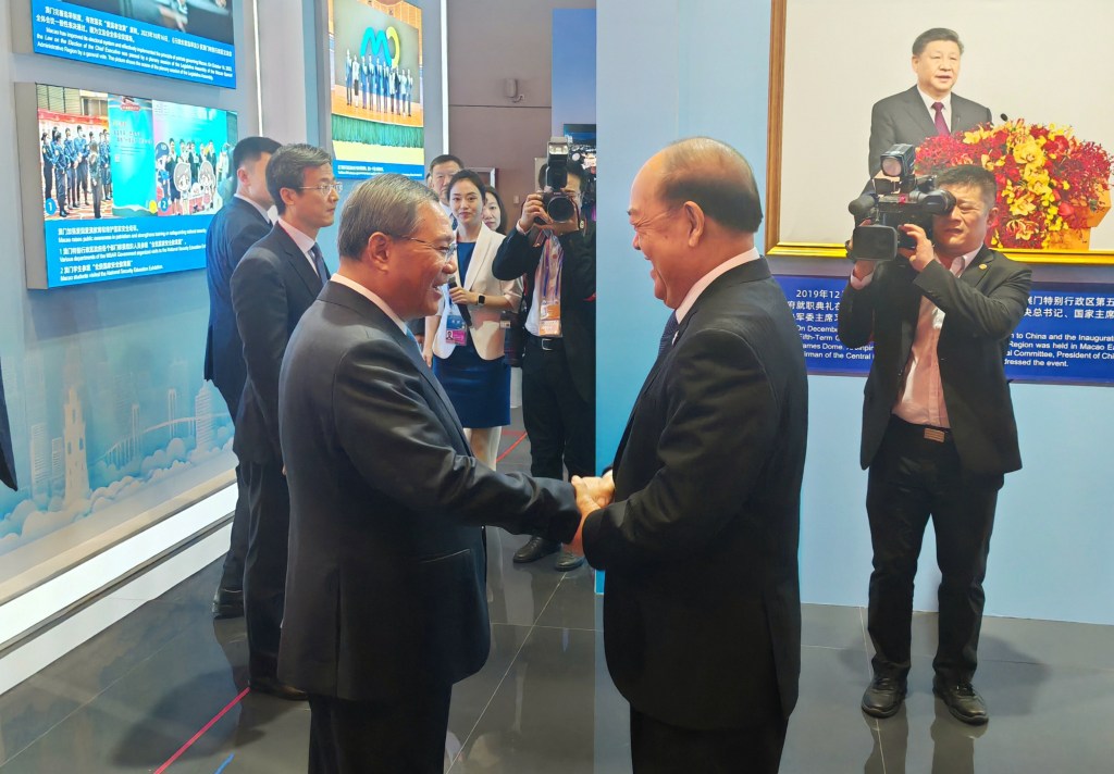 行政長官開幕式後在中國館澳門展區,向李強總理等介紹澳門展區內容及澳門的整體發展現況。澳門展區的主題為「澳門.新時代 新成就」,展示了「堅持與時俱進,提升治理水平」、「堅持開拓創新,推動經濟持續健康發展」及「展望澳門未來發展藍圖」三大主要內容。